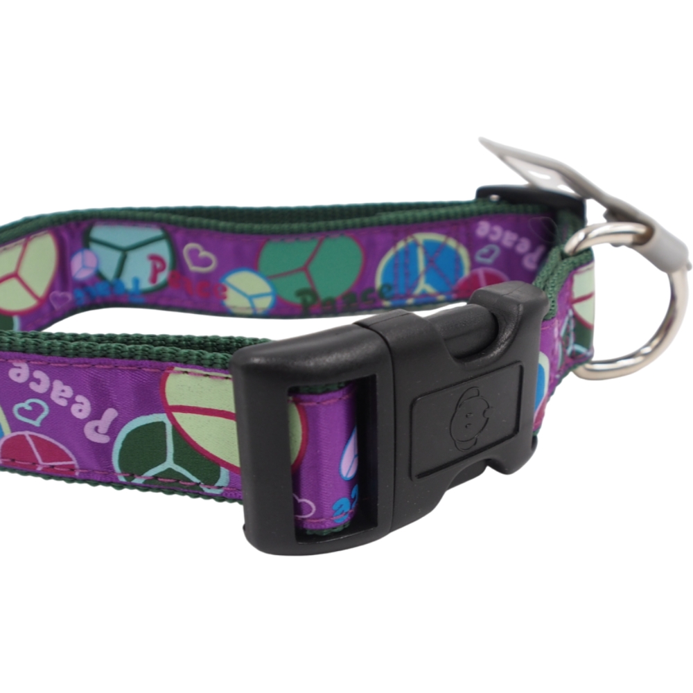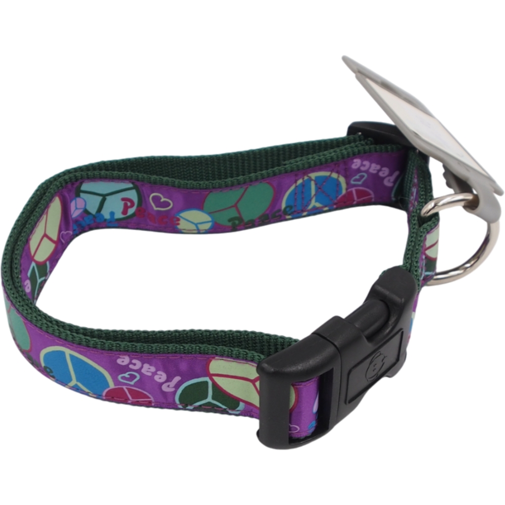 Spalvingas ir tvirtas Hunter antkaklis – puikus pasirinkimas ieškantiems stiliaus ir patikimumo viename. Pagamintas iš aukštos kokybės nailono, jis dekoruotas žaismingais violetiniais, žaliais bei mėlynais raštais su taikos simboliais, kurie suteikia išskirtinumo. Tvirta plastikinė sagtis leidžia greitai ir saugiai užsegti antkaklį, o metalinis žiedas skirtas pavadėlio prisegimui.