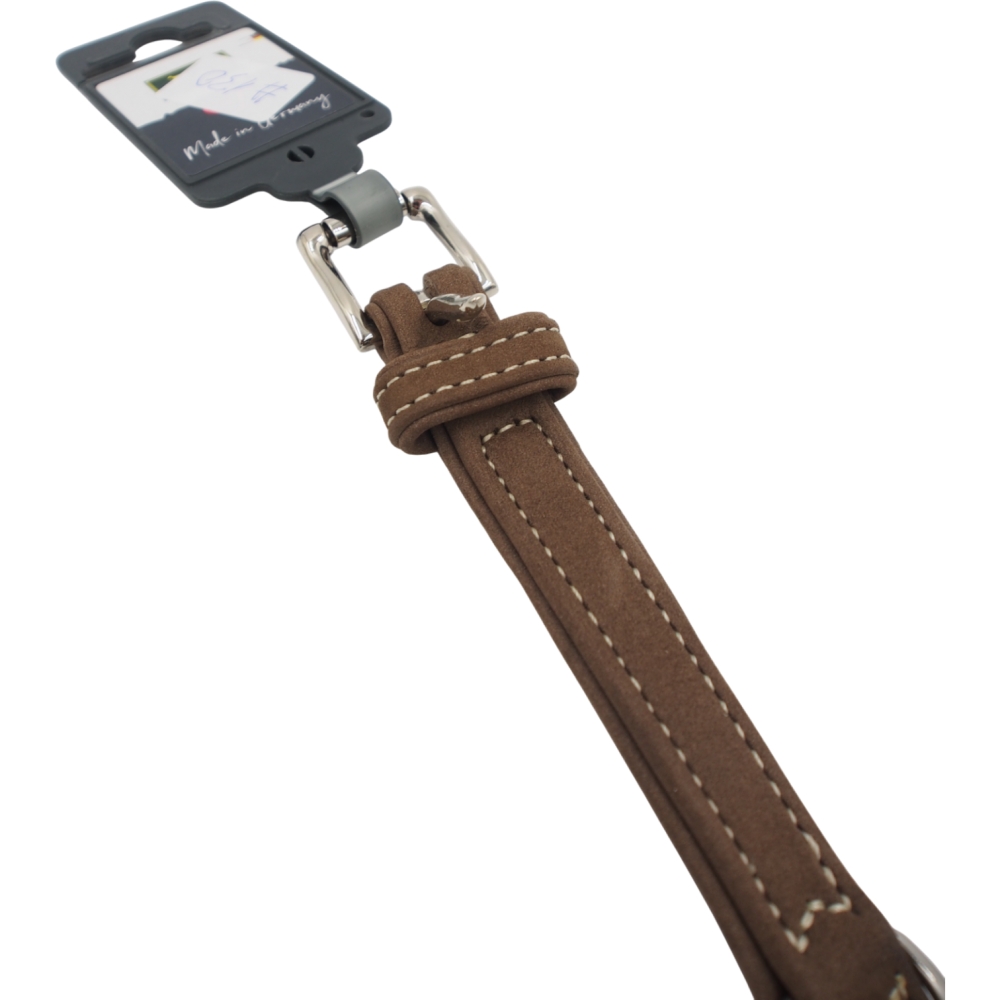 Rudos spalvos oda su kontrastinėmis baltomis siūlėmis suteikia išskirtinį, rankų darbo įspūdį. Metalinė sagtis ir žiedas yra tvirti ir atsparūs korozijai – užtikrina saugumą kasdienio naudojimo metu.