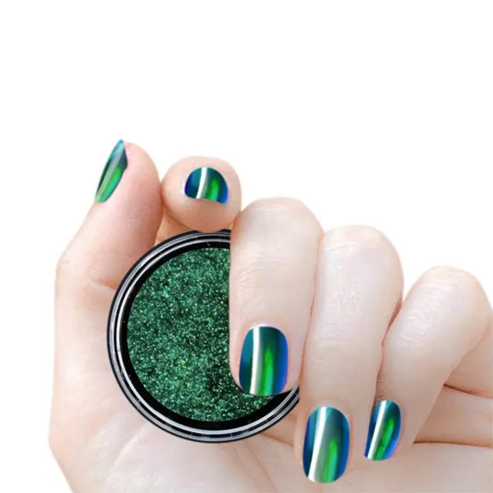 Profesionalios turkio spalvos nagų dulkės nagų dailei, suteikiančios jūsų manikiūrui unikalų, daugiamačio blizgesio. Chameleono efektas keičia spalvą priklausomai nuo šviesos, pereidamas nuo turkio iki subtilių mėlynos ir žalios spalvos atspalvių. Puikiai tinka hibridiniam, geliniam ir akriliniam manikiūrui.