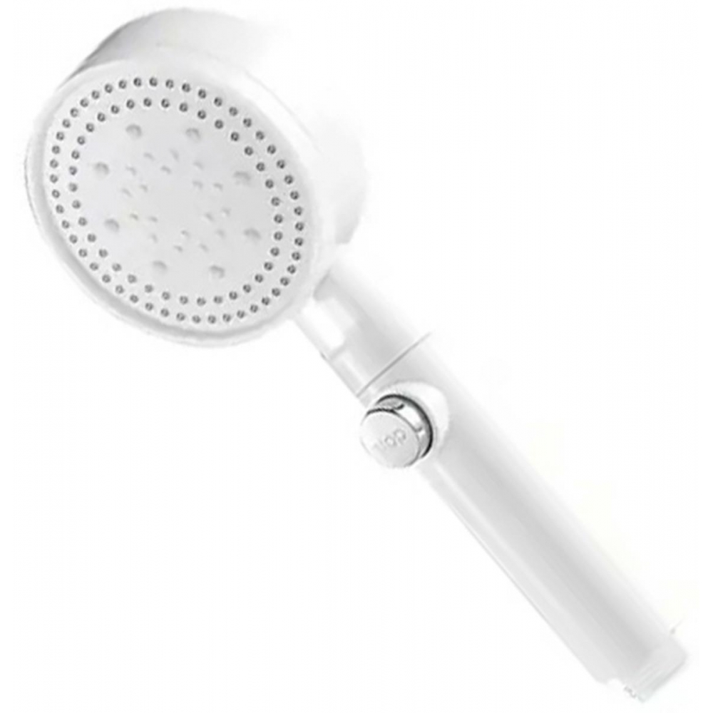Balta dušo galvutė. Skirta montuoti ant standartinės dušo žarnos. Dušo galvutė turi purškimo režimo pasirinkimo funkciją ir sustabdymo funkciją srovei sustabdyti.