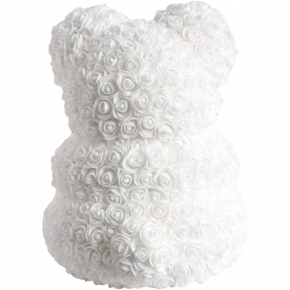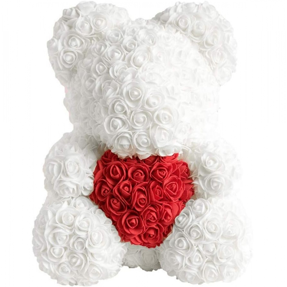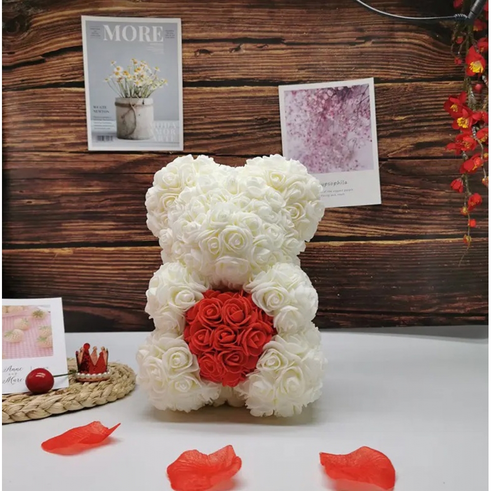 Meškiukas, pagamintas iš baltų rožių ir laikantis raudoną širdelę. Puiki Valentino dienos dovana arba unikali dovana. Meškiukas turi papildomą neutralų baltą LED apšvietimą. :)
