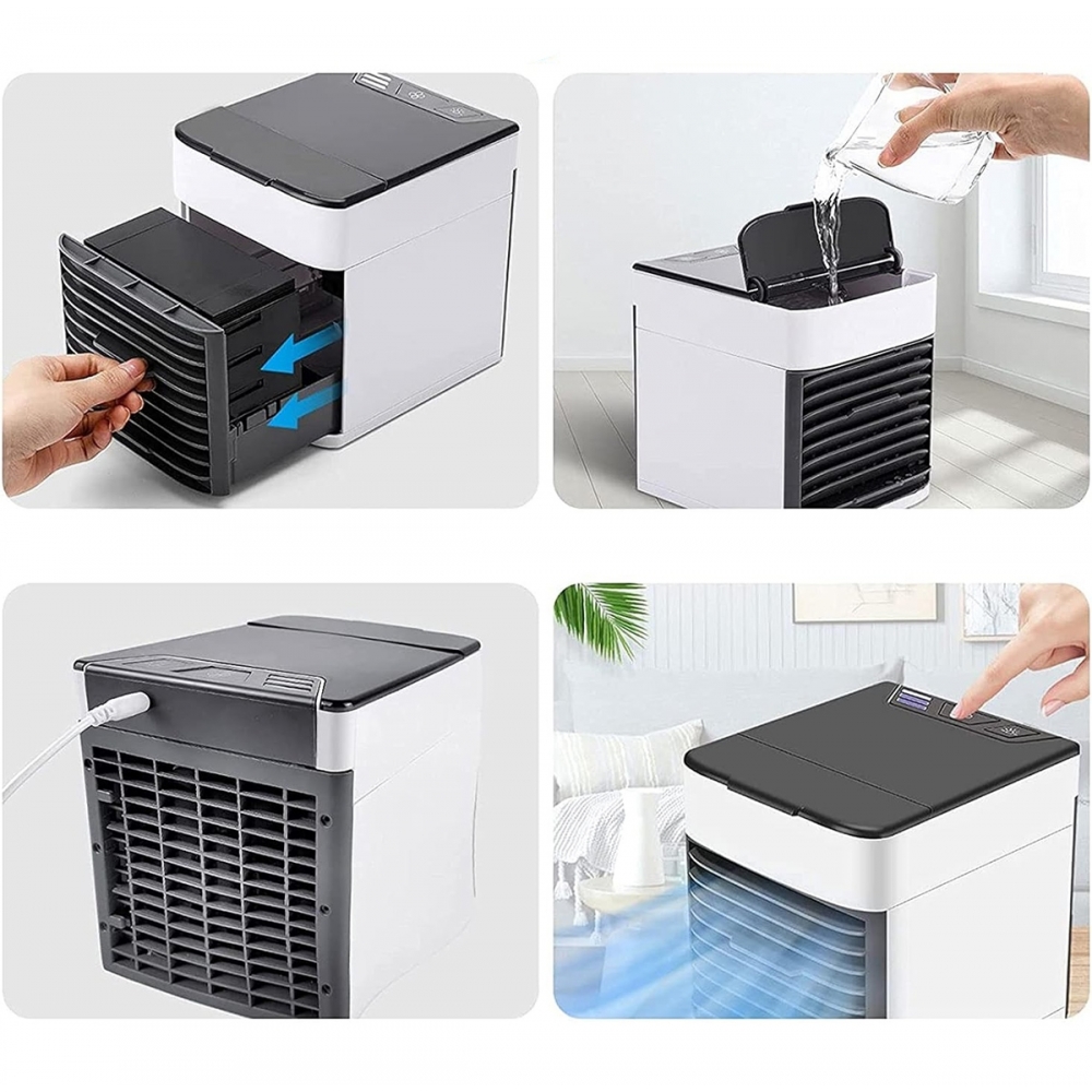 Kompaktiškas, nešiojamas oro vesintuvas, maitinamas per USB. Efektyvus įrankis jūsų artimiausiai aplinkai vėsinti. Jis puikiai veikia kaip efektyvus tradicinio ventiliatoriaus pakaitalas. Tiesiog pripildykite bakelį šalto vandens ir atvėsinkite filtrus, kad mėgautumėtės maloniu, vėsiu oru. Turi osciliavimo funkciją (reguliuojamas oro srauto kampas) ir 4 oro srauto greičio nustatymus.
