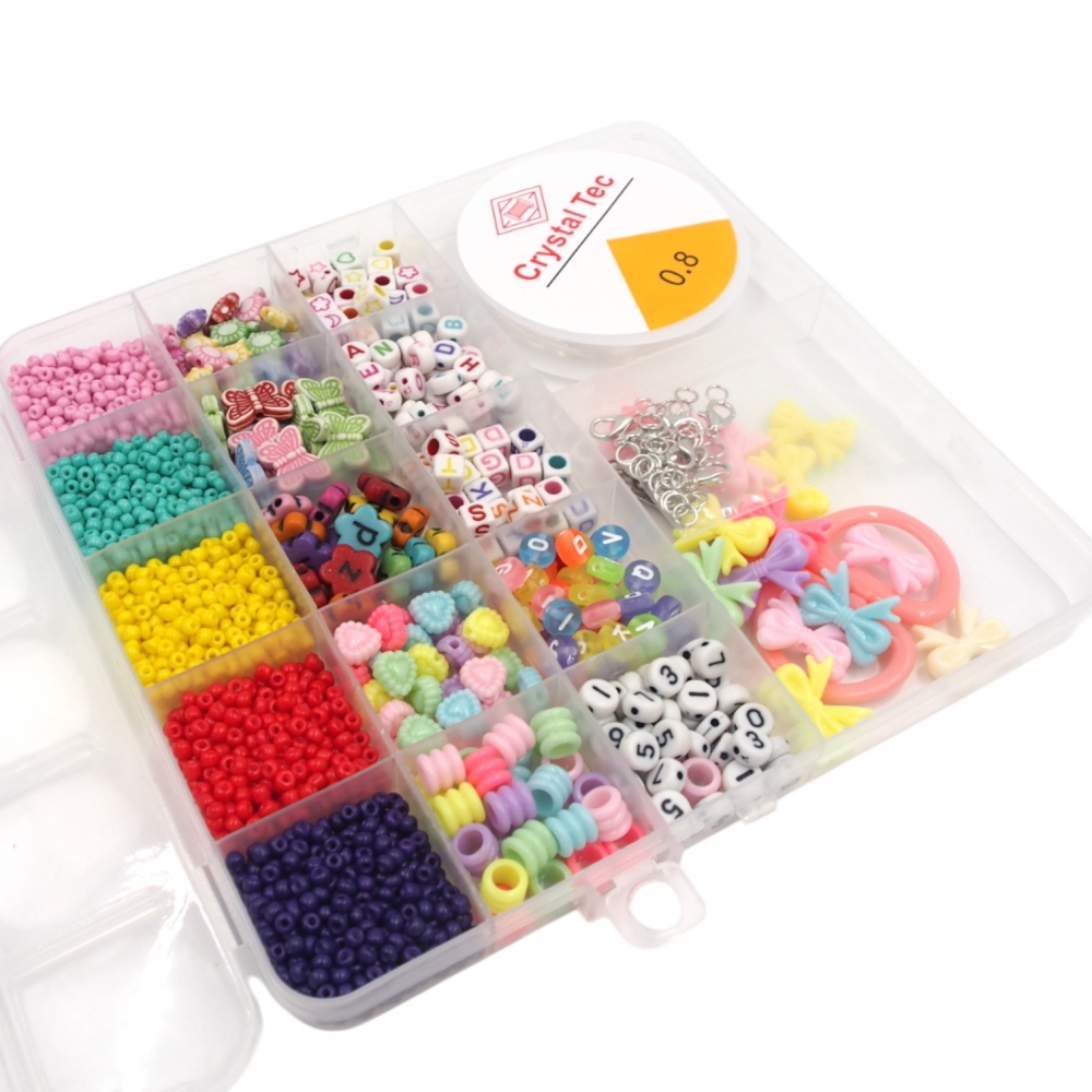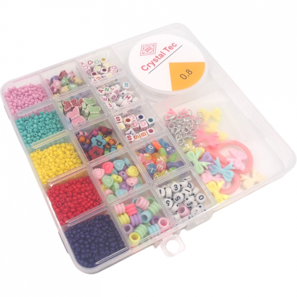 Kūrybinis karoliukų rinkinys – puiki priemonė tiek vaikams, tiek suaugusiems papuošalų kūrimo mėgėjams. Įvairių formų, spalvų ir dydžių karoliukai leis susikurti išskirtines apyrankes, vėrinius ar kitus aksesuarus. Rinkinys supakuotas patogioje plastikinėje dėžutėje su skyreliais, todėl karoliukai nesusimaišo ir yra lengvai pasiekiami.