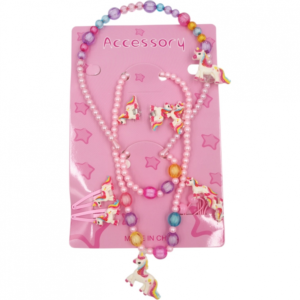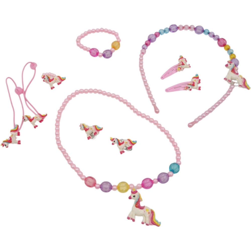 Spalvingas aksesuarų rinkinys su mielais vienaragio motyvais – puikus pasirinkimas mažosioms princesėms. Rinkinyje yra įvairūs papuošalai ir plaukų aksesuarai, kurie leis sukurti išskirtinį įvaizdį kiekvienai šventei ar kasdienai.