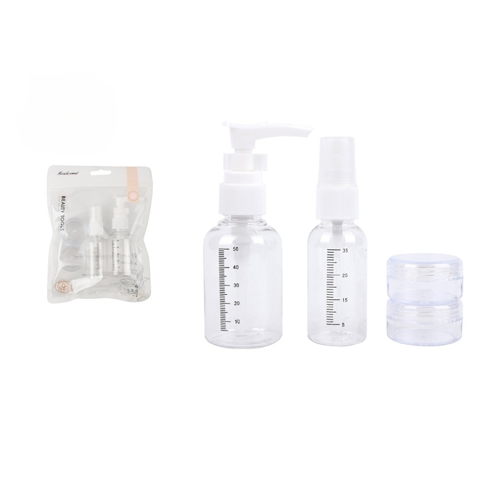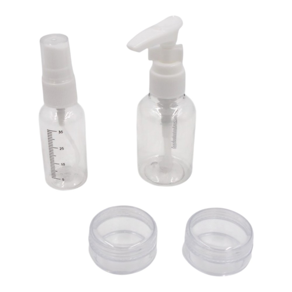 Kelioninių buteliukų rinkinys (4 dalys): 35 ml purškiklis + 50 ml pompa + 2 x 10 g kremo buteliukai