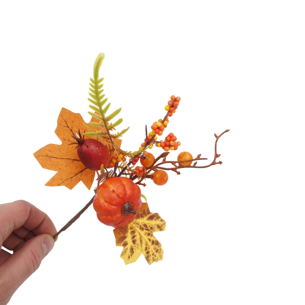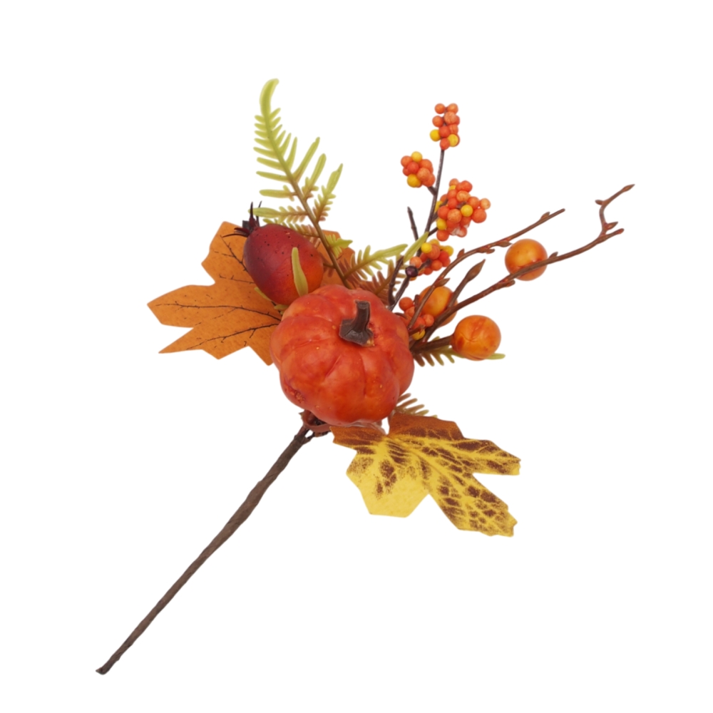 Suteikite savo namams jaukumo ir rudeniškos šilumos su šia dekoratyvine šakele. Kompoziciją sudaro oranžinis moliūgas, rudeniniai lapai, šakelės su uogomis bei žalumynai, kurie puikiai atspindi rudens nuotaiką. Tai puikus pasirinkimas stalo, vainiko ar vazos dekoracijoms.