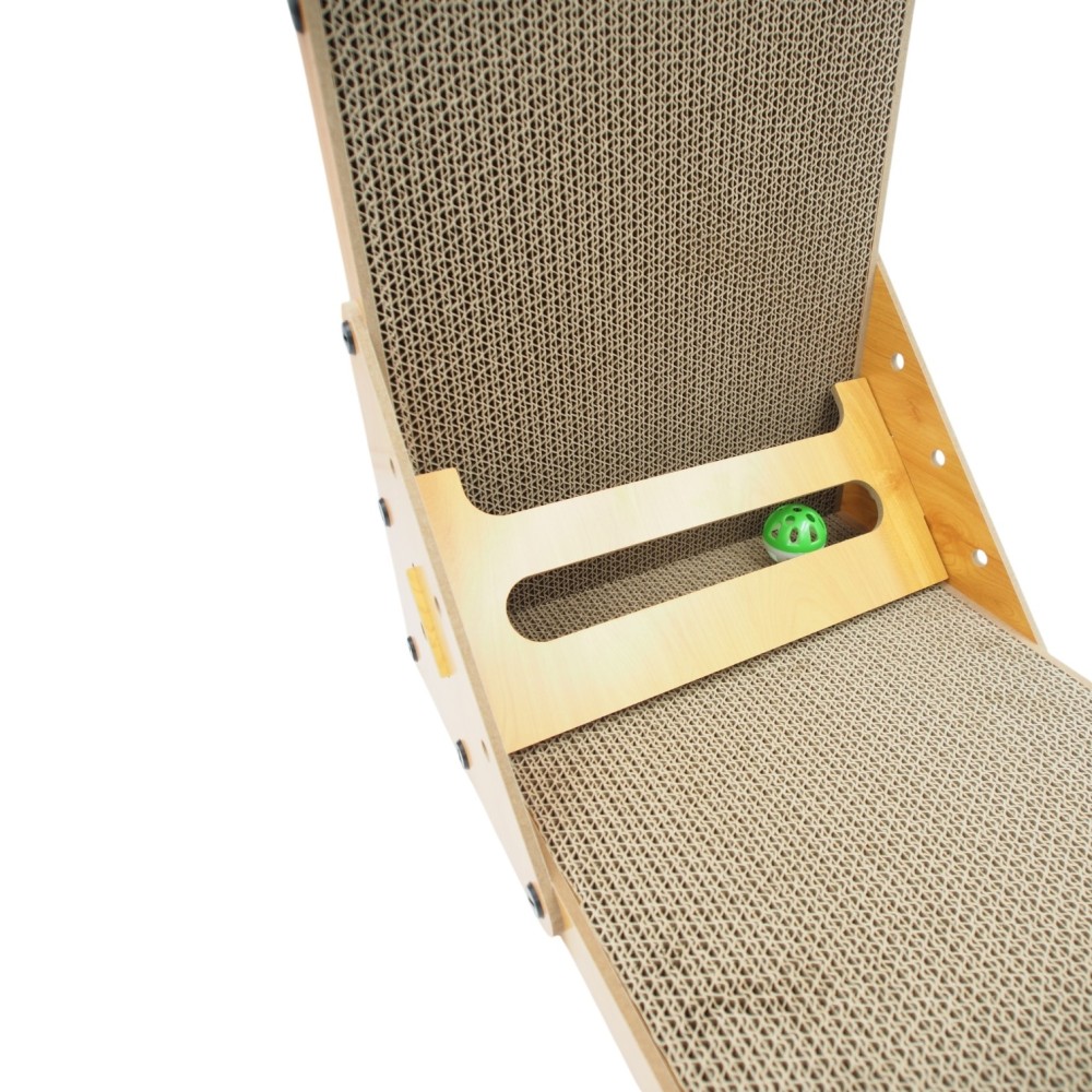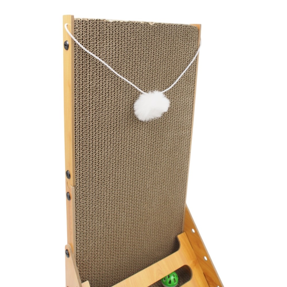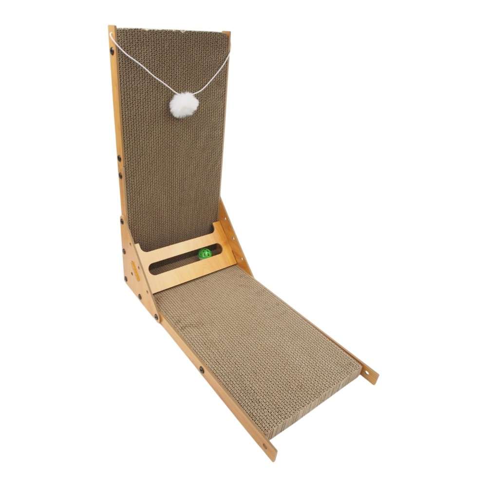 Didelė kampinė kartoninė draskyklė katėms su mediniu rėmu ir žaisliuku, 57 x 28 x 60 cm