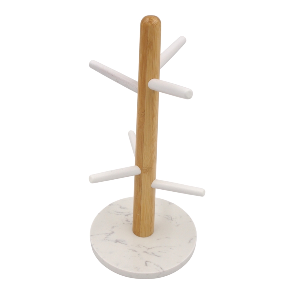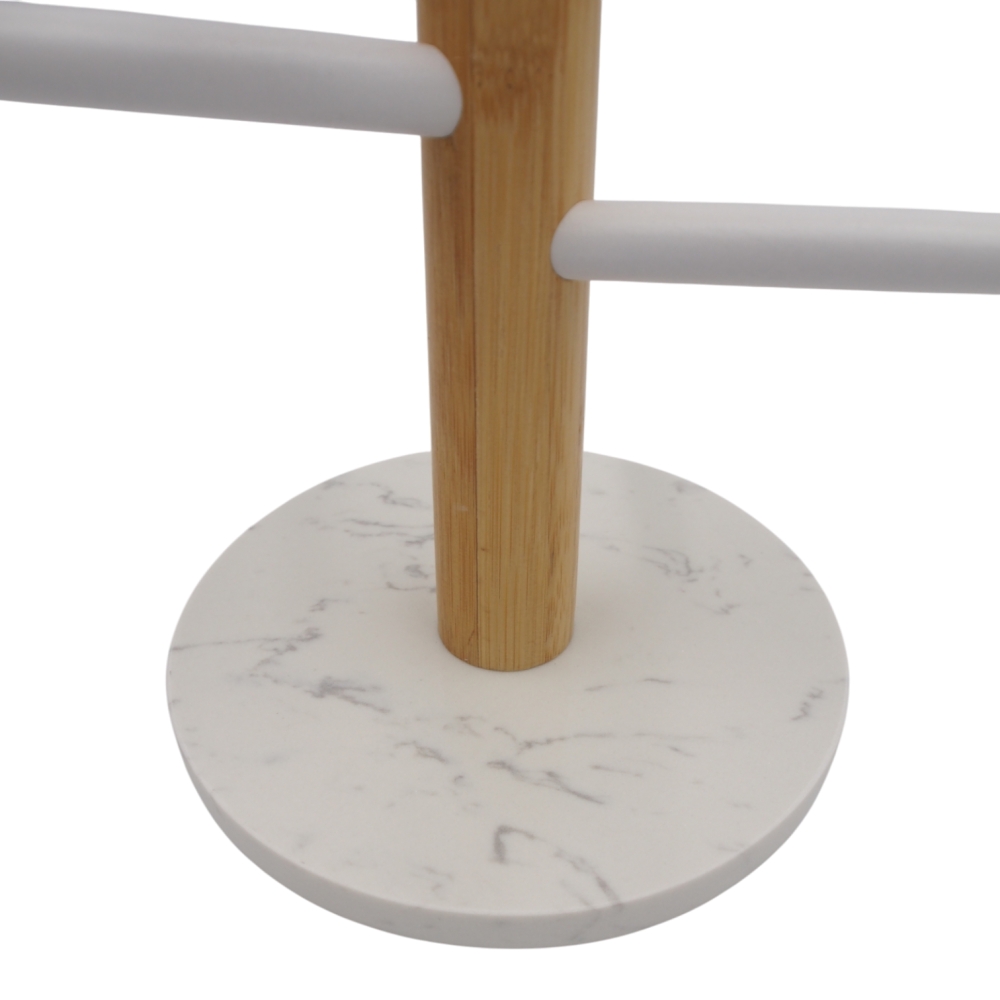 Laikiklio pagrindas pagamintas iš aukštos kokybės marmuro – tai masyvi ir tvirta medžiaga, kuri užtikrina stabilumą net tuomet, kai laikiklis pilnai užkrautas puodeliais. Bambuko kotas suteikia šilumos ir natūralumo pojūtį, o balti šoniniai laikikliai elegantiškai išsiskiria, pabrėždami modernų akcentą.