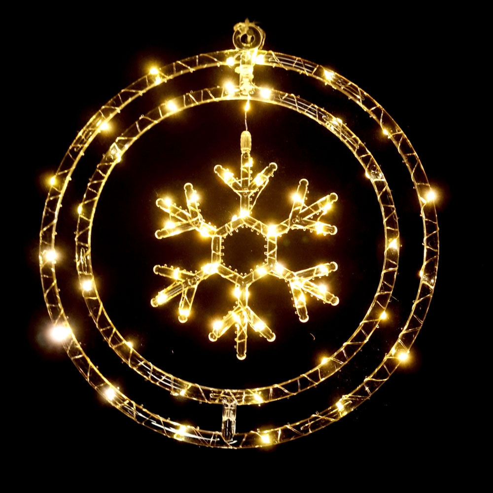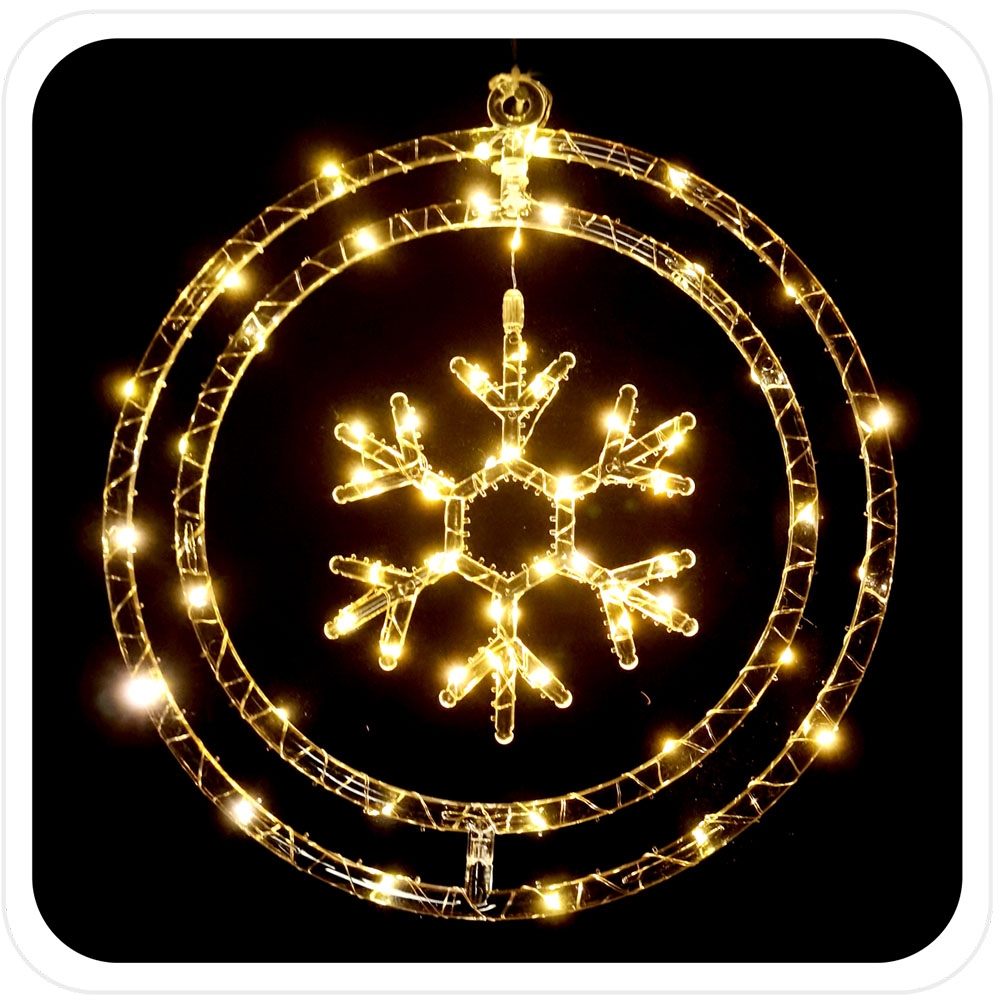 Kalėdinė šviečianti dekoracija – snaigė ratelyje, 60 LED, šiltai balta, baterijomis maitinama