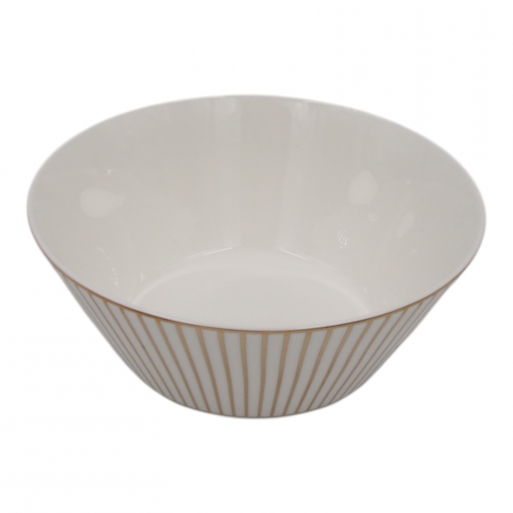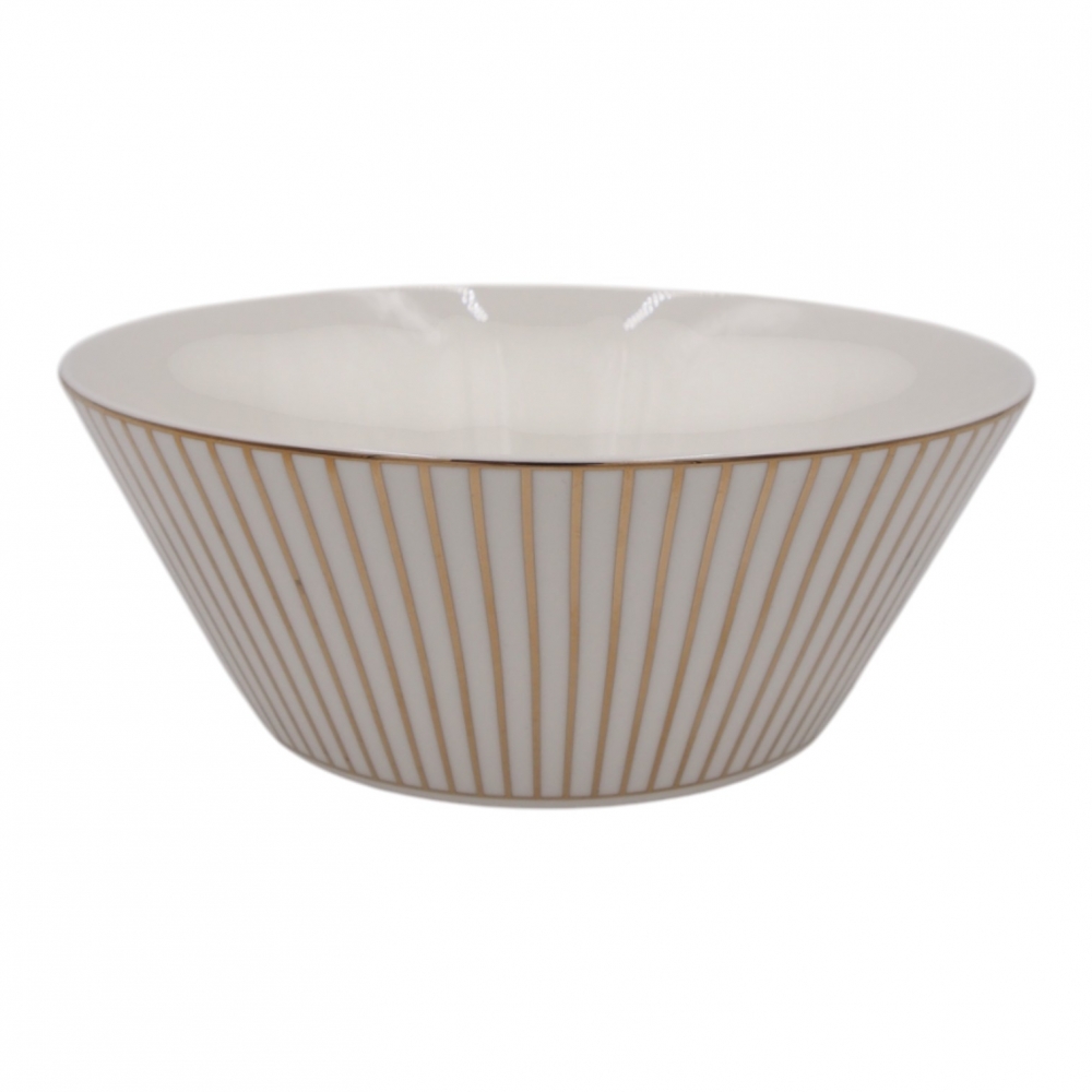 Elegantiškas keraminis dubuo, dekoruotas subtiliomis auksinėmis vertikaliomis linijomis, suteiks Jūsų stalui prabangos ir modernumo. Puikiai tinka sriuboms, salotoms, užkandžiams ar vaisiams patiekti.