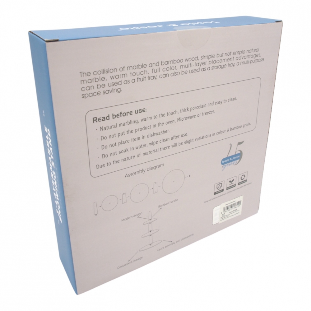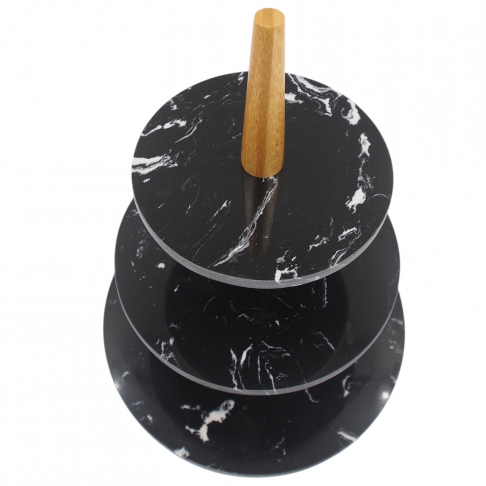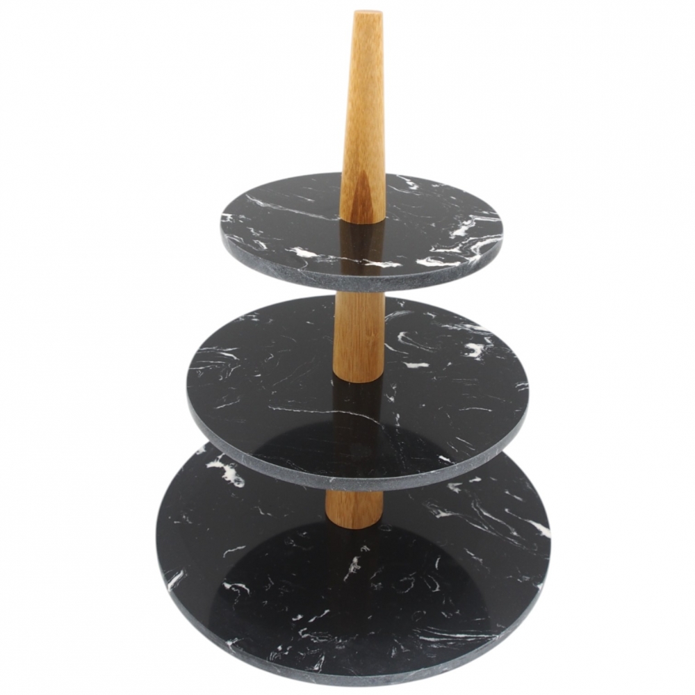 Elegantiškas 3 aukštų serviravimo stovas iš juodo marmuro imitacijos paviršių ir bambuko medžio rankenos – puikus pasirinkimas desertams, vaisiams, užkandžiams ar pyragėliams patiekti. Stovas ne tik funkcionalus, bet ir stilingas, todėl taps išskirtine jūsų šventinio ar kasdieninio stalo detale.