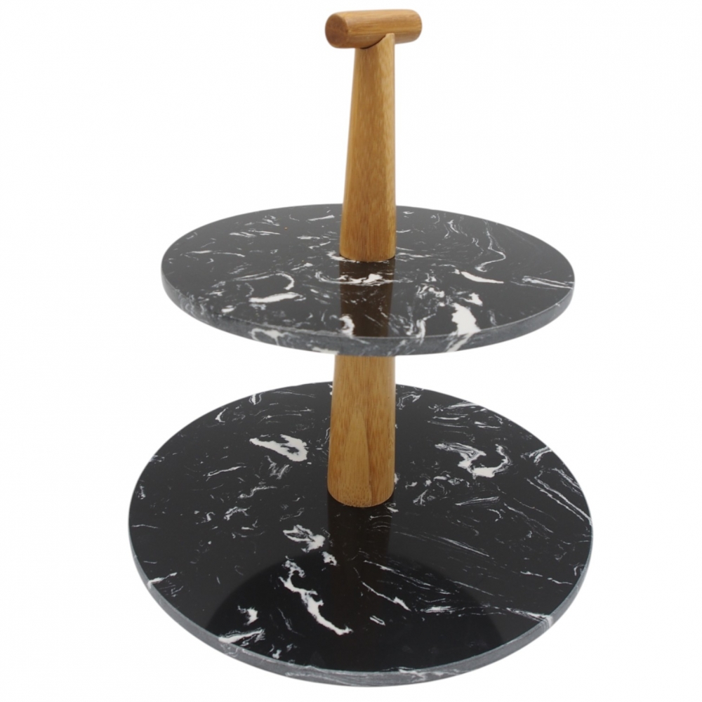 Stilingas 2 aukštų serviravimo stovas pagamintas iš juodo marmuro imitacijos paviršių ir bambuko medžio rankenos. Tai elegantiškas sprendimas desertams, vaisiams, užkandžiams ar pyragėliams patiekti tiek šventėse, tiek kasdienai.