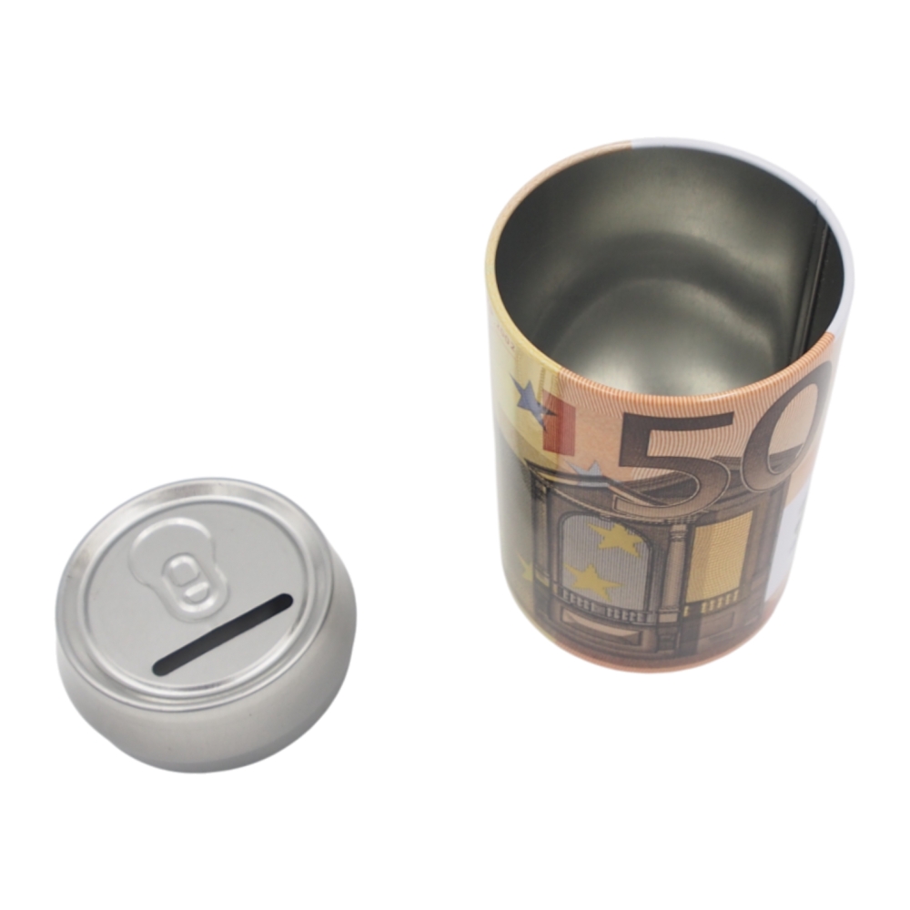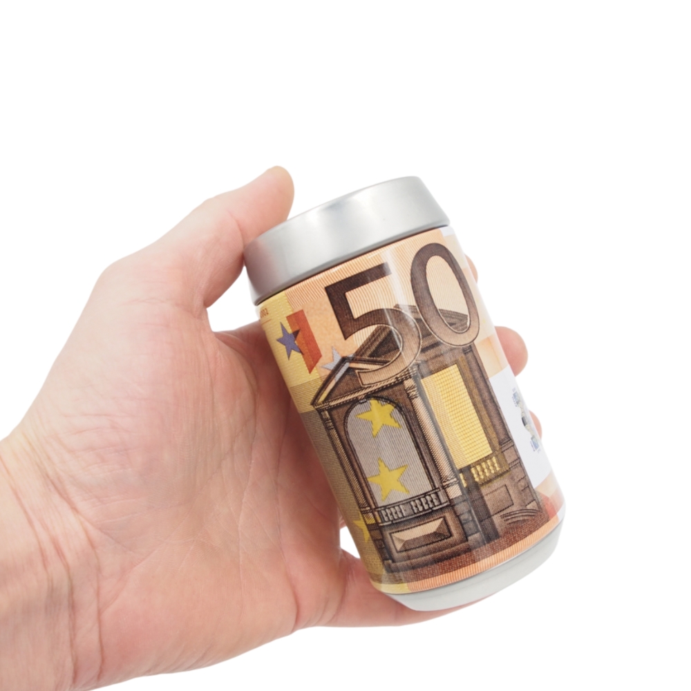 Linksma ir praktiška taupyklė, pagaminta iš metalo, su unikaliu dizainu, imituojančiu euro banknotus (20 €, 50 €, 100 €). Iš pirmo žvilgsnio primena tikrą gėrimo skardinę, todėl puikiai tiks kaip dovana ar originali interjero detalė.