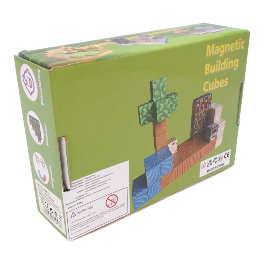 Magnetiniai kubeliai tvirtai jungiasi tarpusavyje, todėl konstrukcijos išlieka stabilios net žaidžiant aktyviau. Kiekvienas kubelis padengtas detalia tekstūra – nuo vandens ir žolės iki medžio, akmens ar net knygų lentynų. Tai leidžia vaikams kurti spalvingus, įdomius ir labai tikroviškus statinius, kurie tampa puikia lavinamąja veikla namuose.