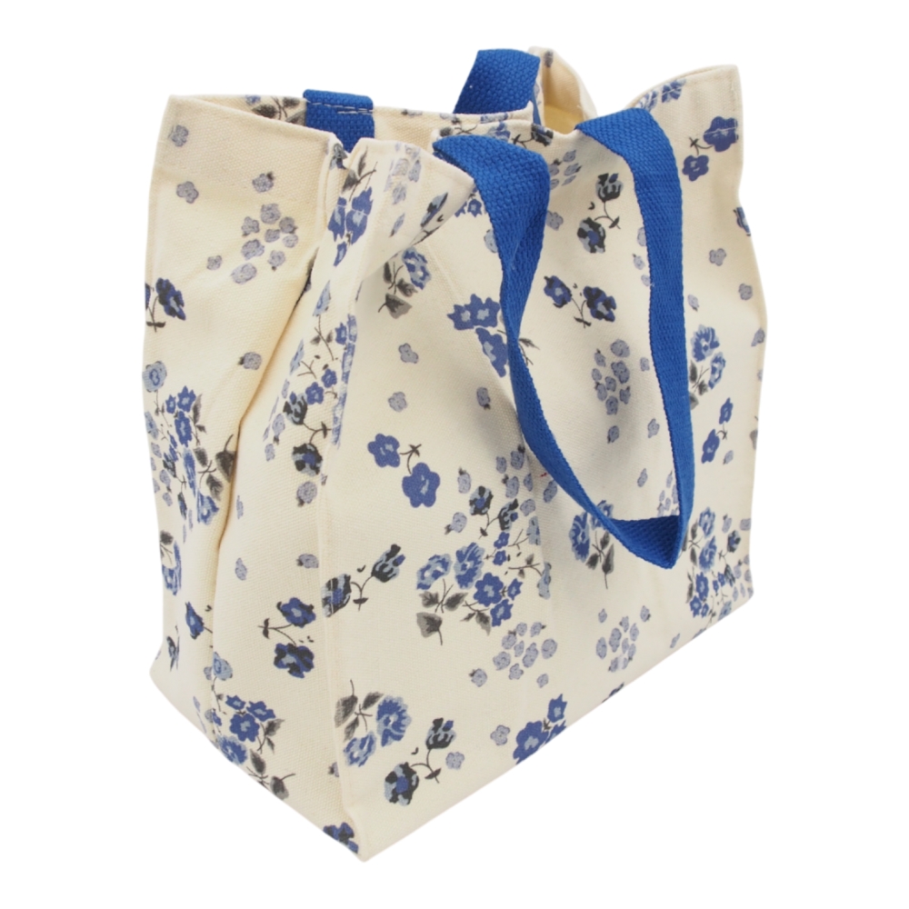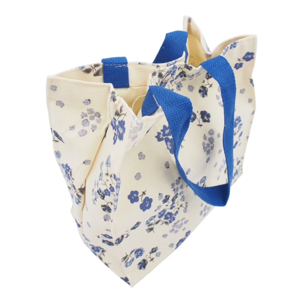 Šviesaus audinio krepšelis su mėlynų gėlių raštu suteikia stilingą išvaizdą, o tvirtos rankenėlės leidžia patogiai nešti rankoje.