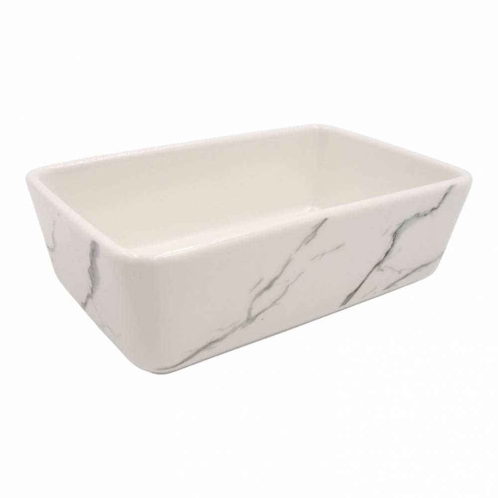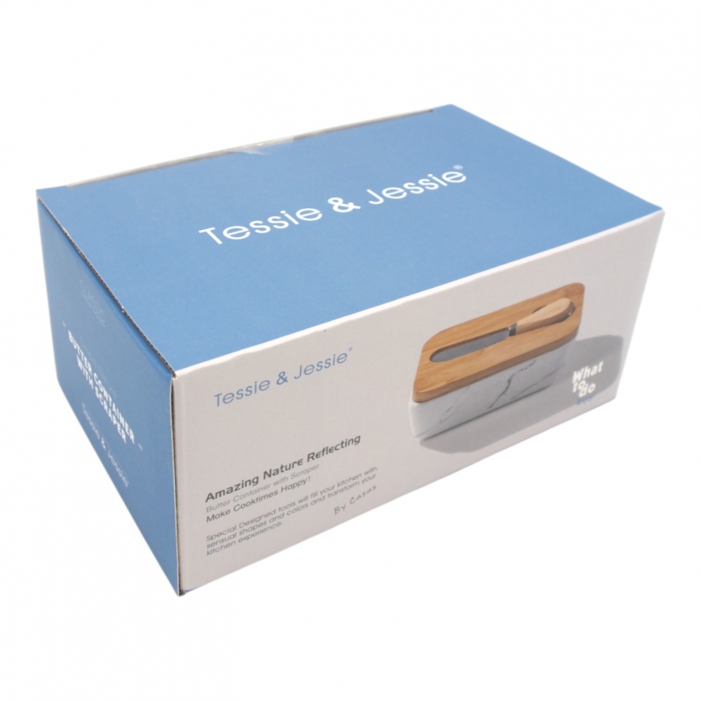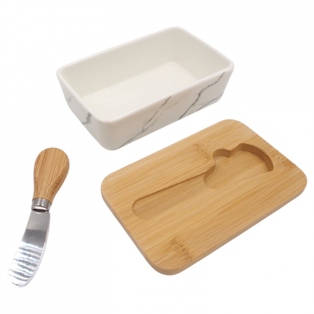 Stilingas sviestinės indas, pagamintas iš marmuro imitacijos keramikos, su natūralaus bambuko dangteliu ir patogiu sviesto peiliuku. Šis elegantiškas indas ne tik užtikrina patogų sviesto laikymą, bet ir tampa išskirtine stalo ar virtuvės interjero detale.