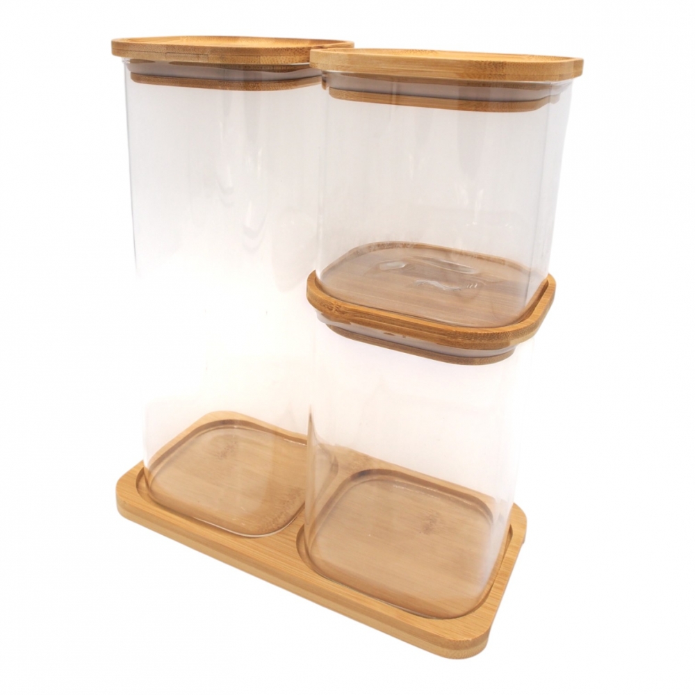 Rinkinį sudaro: 3 stikliniai indai su dangteliais + bambukinis stovas