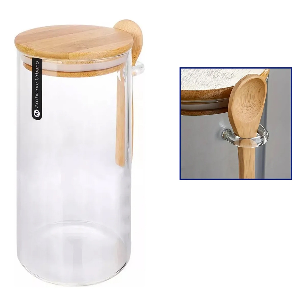 Stiklinis maisto produktų indas su mediniu dangteliu ir šaukšteliu, 1200 ml – stilingam ir patogiam laikymui