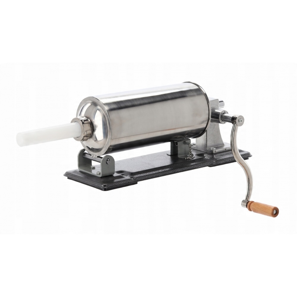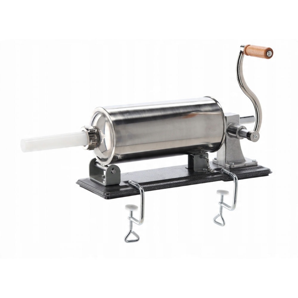 Rankinė nerūdijančio plieno dešrų kimšimo mašina skirta naminių dešrų, vyniotinių ir kitų mėsos gaminių gamybai. Tvirta konstrukcija, didelė talpa ir stabilus tvirtinimas prie stalo leidžia patogiai ir tiksliai kimšti dešras namų sąlygomis.