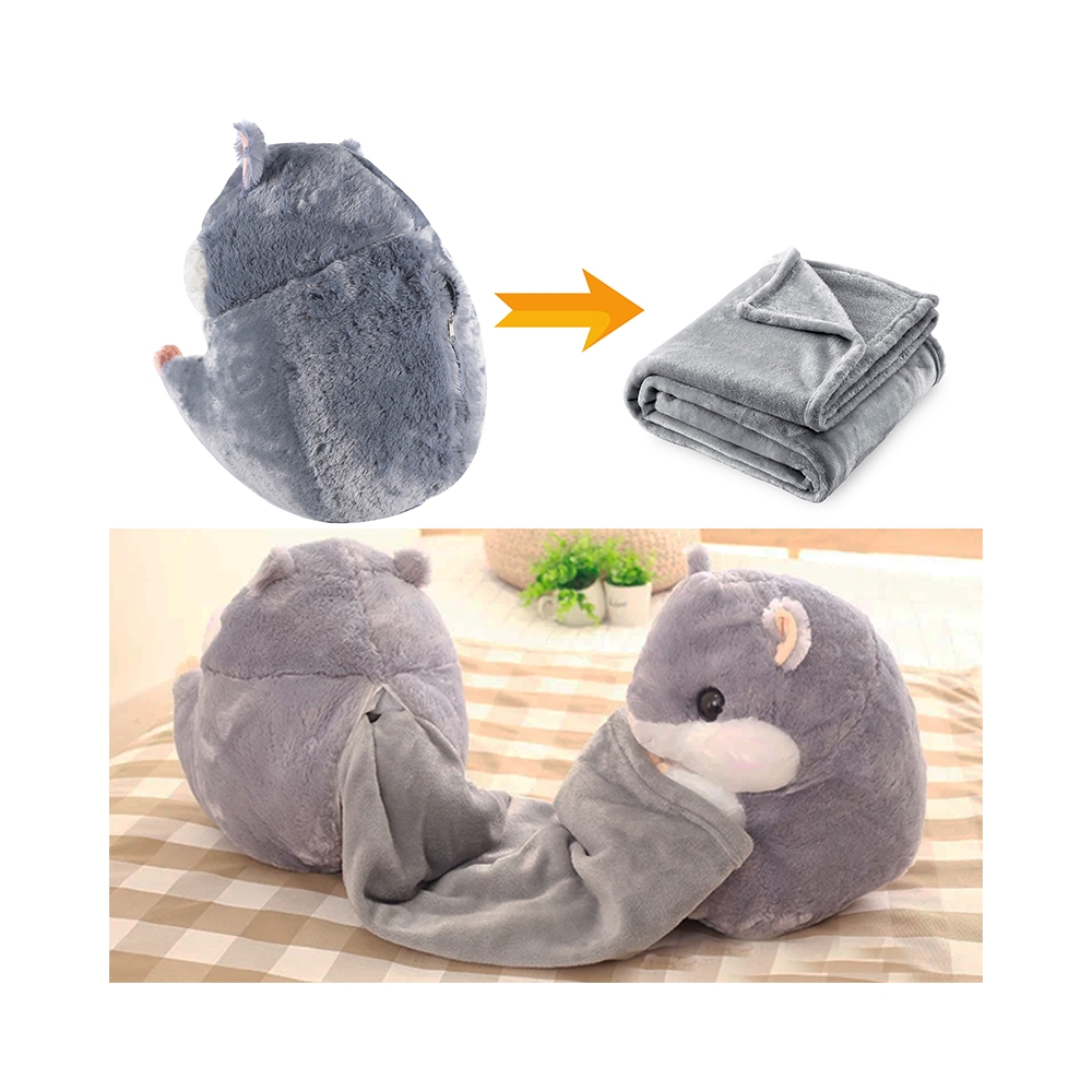 Minkštas pliušinis žiūrkėnas–pagalvėlė su paslėptu pledu