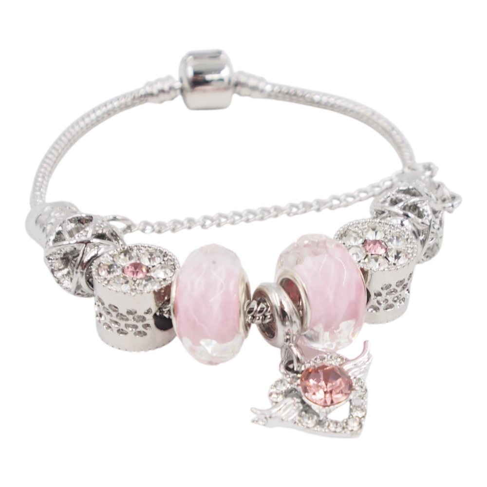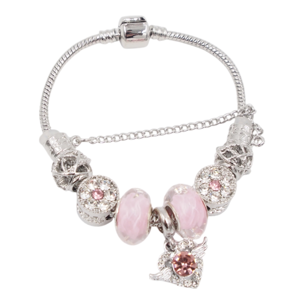 Romantiško ir elegantiško dizaino moteriška apyrankė, dekoruota švelniai rožiniais karoliukais bei išskirtiniu širdelės formos pakabuku su sparneliais. Sidabro spalvos metalinės detalės ir blizgūs akcentai suteikia apyrankei subtilaus žavesio bei prabangos pojūtį. Širdelės pakabukas simbolizuoja meilę, švelnumą ir išskirtinį ryšį.