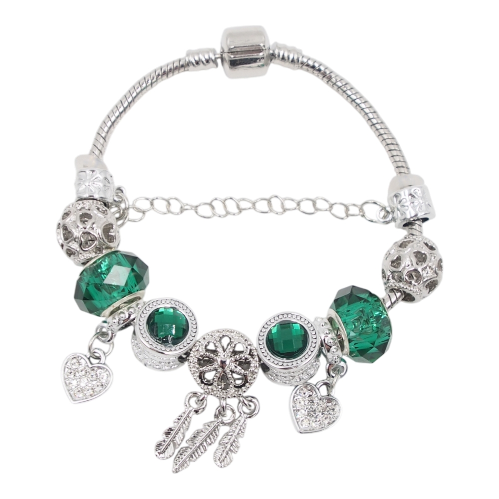 Moteriška apyrankė su žaliais karoliukais ir pakabukais, sidabro spalvos