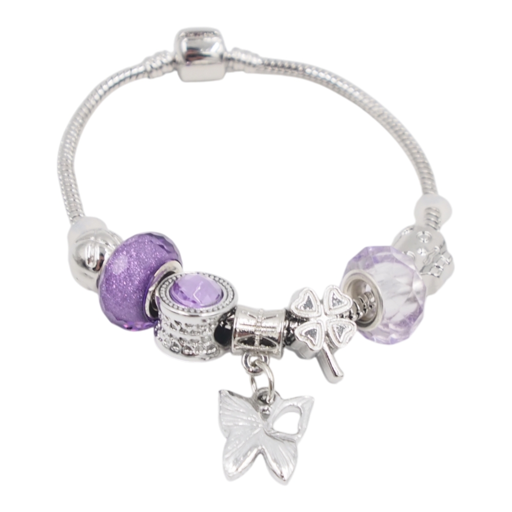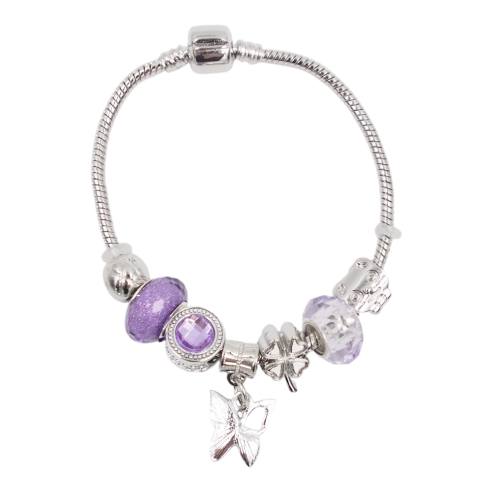 Moteriška apyrankė su violetiniais karoliukais ir drugelio pakabuku, sidabro spalvos