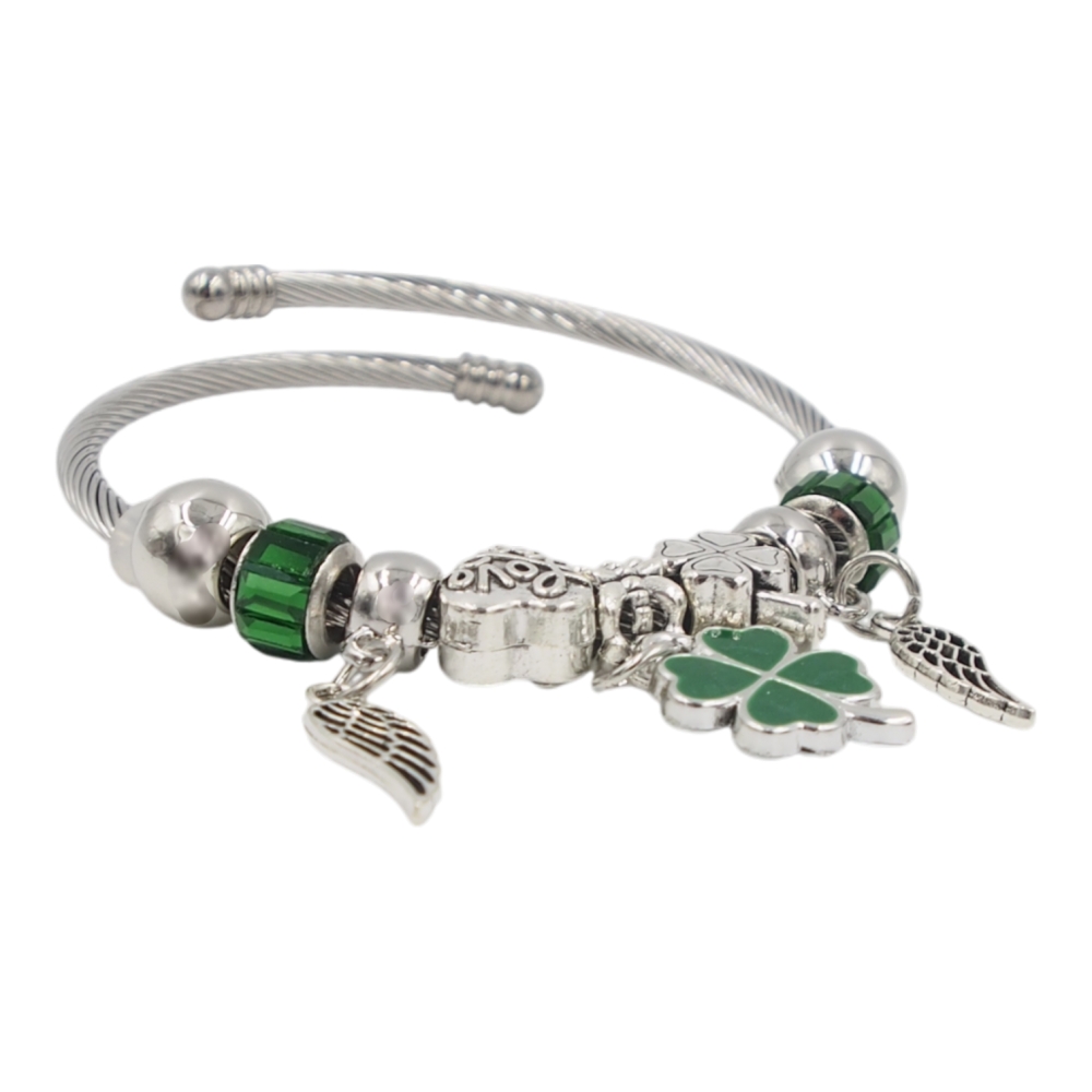 Elegantiška ir simbolinė apyrankė, kuri subtiliai papildo kasdienį ar šventinį įvaizdį. Sidabro spalvos pintas metalinis pagrindas dera su žaliais stiklo karoliukais ir prasmingais pakabukais – keturlapiu dobilu, angelo sparnais ir dekoratyviniais elementais. Žalia spalva simbolizuoja sėkmę, harmoniją ir gyvybingumą, todėl ši apyrankė gali tapti ne tik stiliaus detale, bet ir prasmingu aksesuaru.