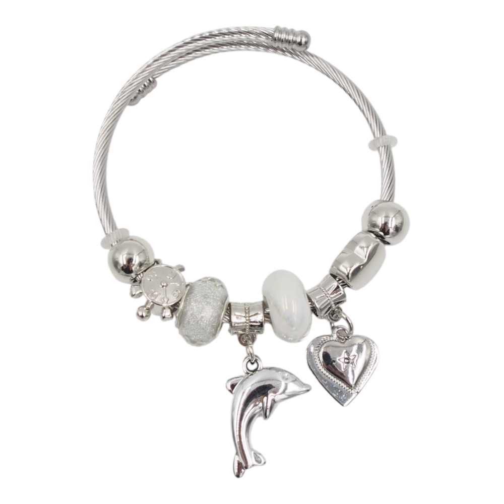 Elegantiška ir šviesaus dizaino moteriška apyrankė, dekoruota baltais ir sidabro spalvos karoliukais bei subtiliais pakabukais. Švarus spalvų derinys suteikia apyrankei lengvumo, elegancijos ir universalumo, todėl ji puikiai tinka tiek kasdieniam nešiojimui, tiek ypatingoms progoms. Delfino ir širdelės formos pakabukai suteikia aksesuarui simbolinės prasmės ir žavesio.