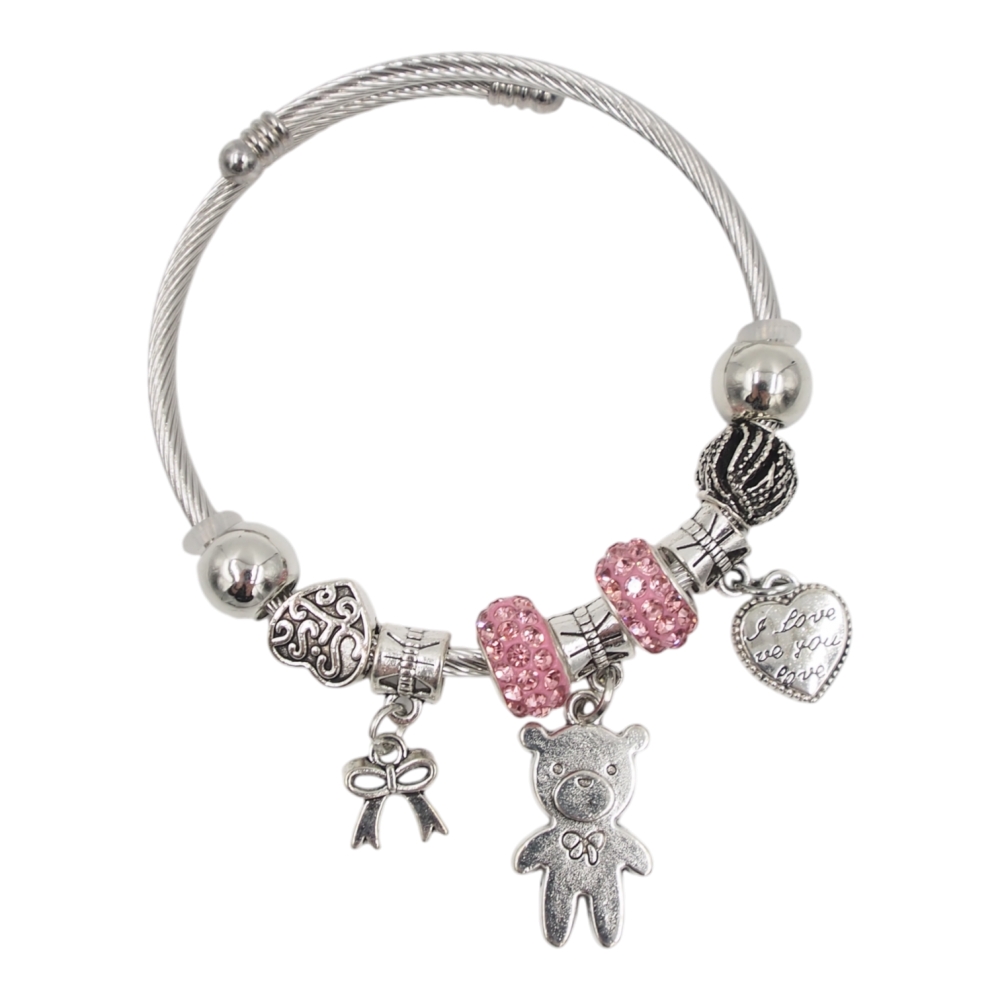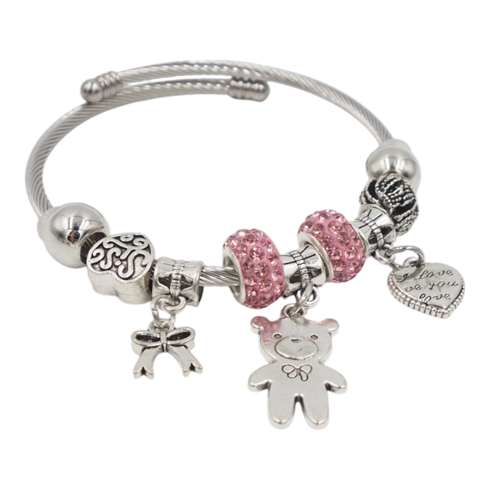 Žaismingo ir romantiško dizaino moteriška apyrankė, dekoruota rožiniais karoliukais ir mielais pakabukais. Sidabro spalvos detalės kartu su švelniais rožiniais akcentais sukuria jaukų ir moterišką įvaizdį. Meškiuko, kaspinėlio ir širdelės formos pakabukai suteikia apyrankei žavesio bei išskirtinumo.