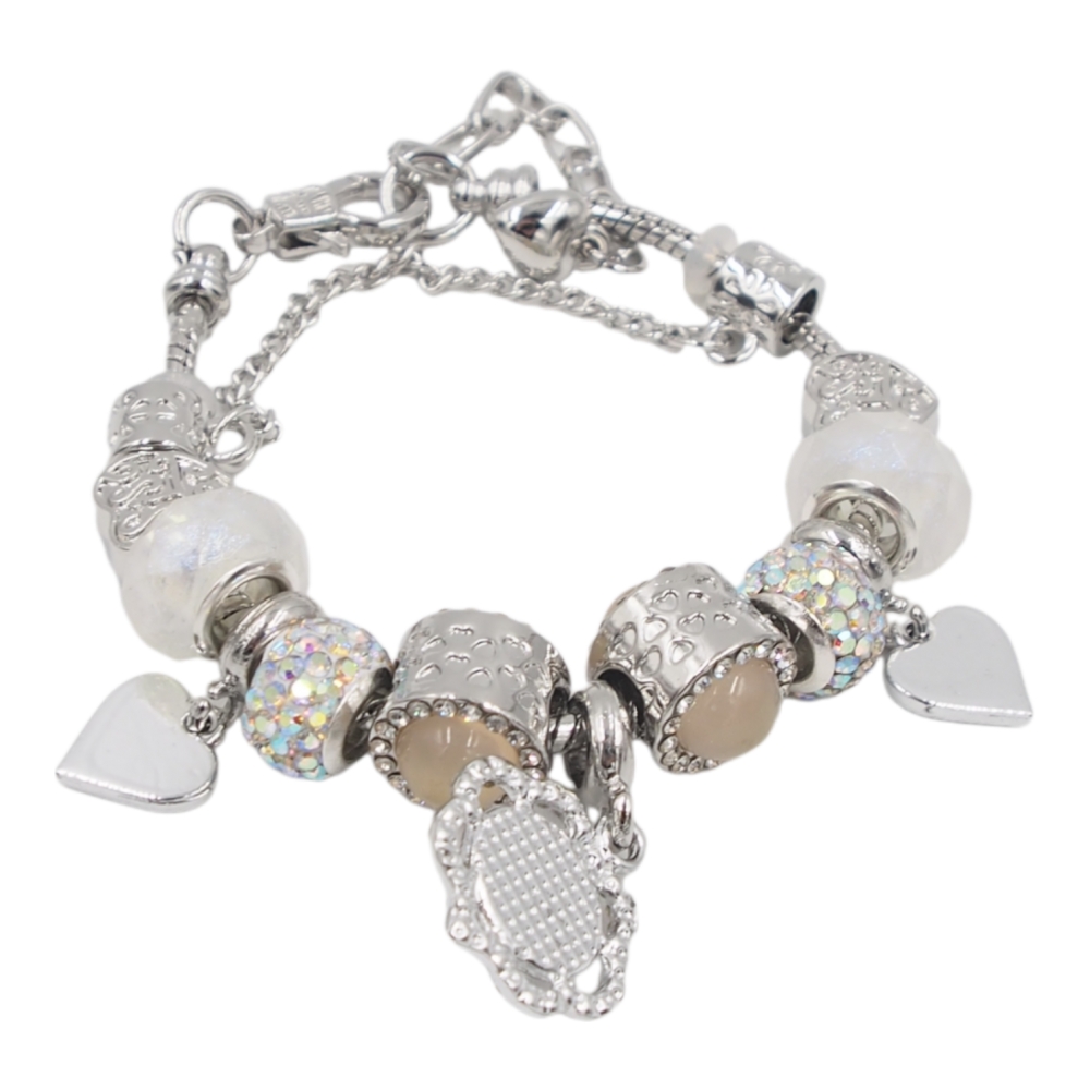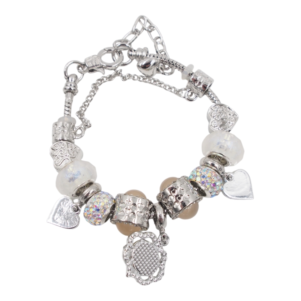 Moteriška apyrankė su karoliukais ir pakabukais, sidabro–kreminės spalvos