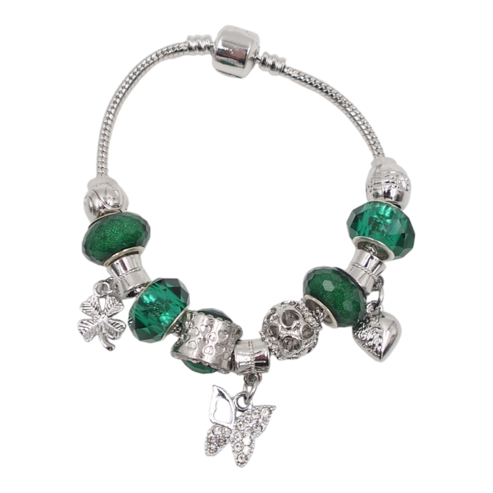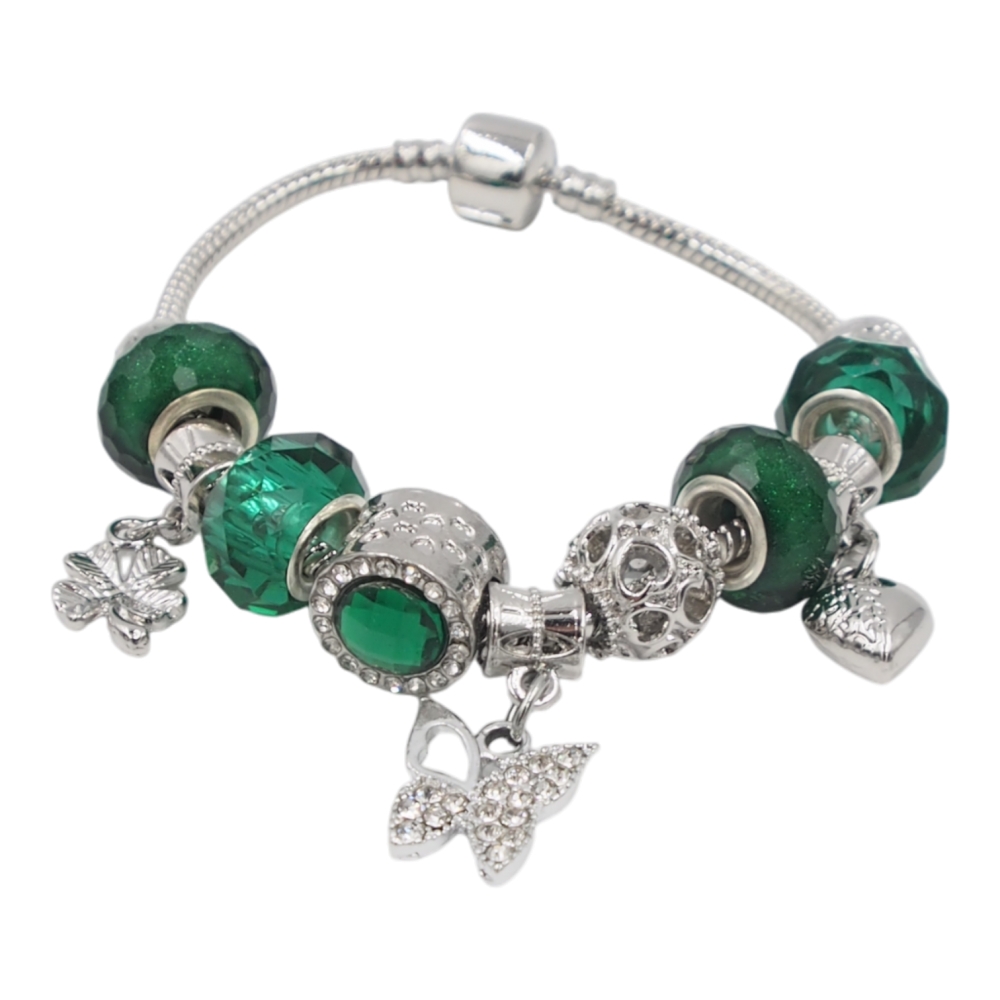 Stilinga ir elegantiška moteriška apyrankė, dekoruota žaliais karoliukais bei subtiliais pakabukais. Sidabro spalvos detalės kartu su sodriai žaliais akcentais suteikia apyrankei išskirtinį ir prabangų įvaizdį. Dekoratyviniai pakabukai – drugelis, širdelė ir kiti ornamentai – suteikia aksesuarui žaismingumo ir moteriškumo.