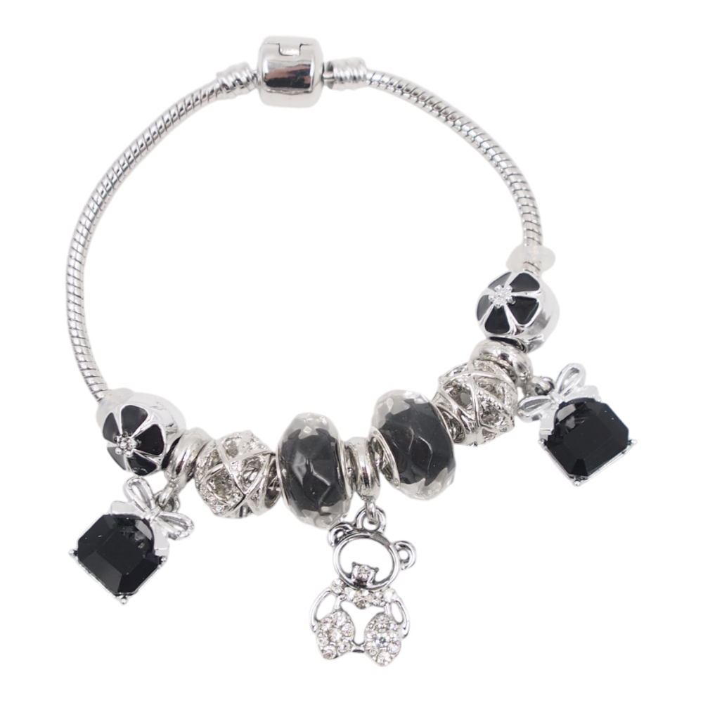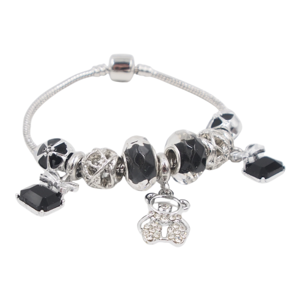 Elegantiška ir išskirtinio dizaino moteriška apyrankė, dekoruota stilingais karoliukais ir pakabukais. Sidabro spalvos apyrankė su juodais akcentais ir blizgančiomis detalėmis puikiai tinka tiek kasdieniam nešiojimui, tiek ypatingoms progoms. Subtilūs pakabukai suteikia apyrankei žaismingumo ir išskirtinumo.