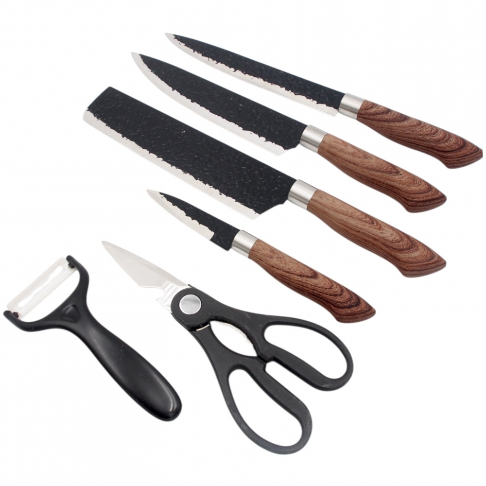 Virtuvinių peilių rinkinys TPLUS 6 vnt. (medžio imitacijos rankenos, plaktos tekstūros ašmenys)