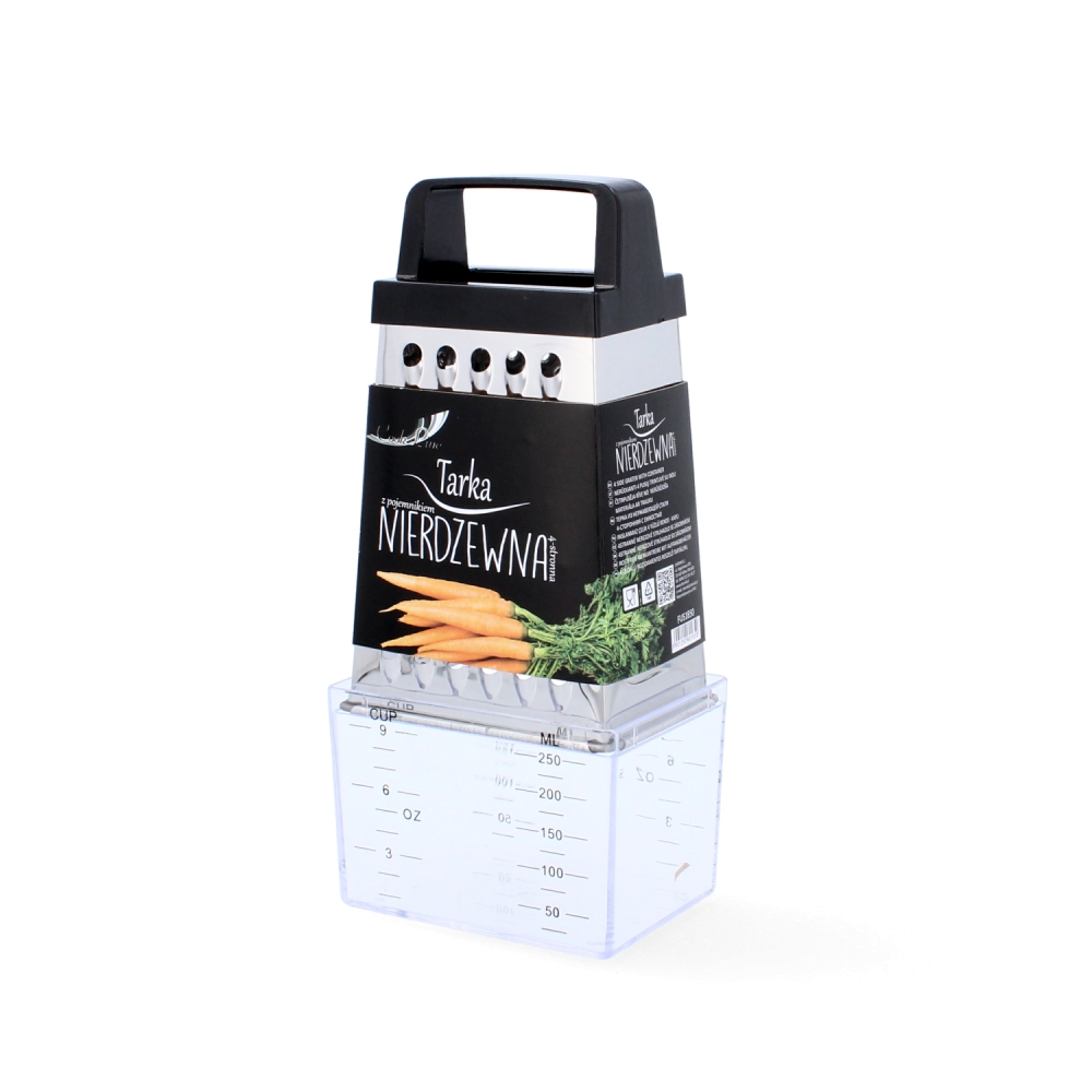 Universali ir praktiška nerūdijančio plieno tarka su talpiu plastikiniu indeliu – nepakeičiamas pagalbininkas kasdienėje virtuvėje. Keturi skirtingi tarkavimo paviršiai leidžia patogiai ir greitai paruošti įvairius ingredientus – nuo daržovių iki sūrio ar šokolado. Permatomas indelis apačioje surenka tarkuotus produktus, todėl darbo vieta išlieka švari ir tvarkinga.