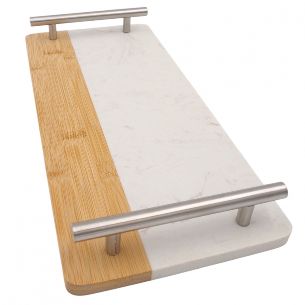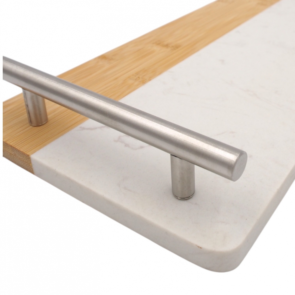 Elegantiškas serviravimo padėklas, pagamintas iš marmuro, bambuko ir nerūdijančio plieno rankenų. Dėl savo išskirtinio dizaino jis puikiai tinka patiekti užkandžius, desertus, sūrius ar vaisius. Tvirtos metalinės rankenos užtikrina patogų nešimą, o marmuro ir bambuko derinys suteikia natūralumo bei modernumo.