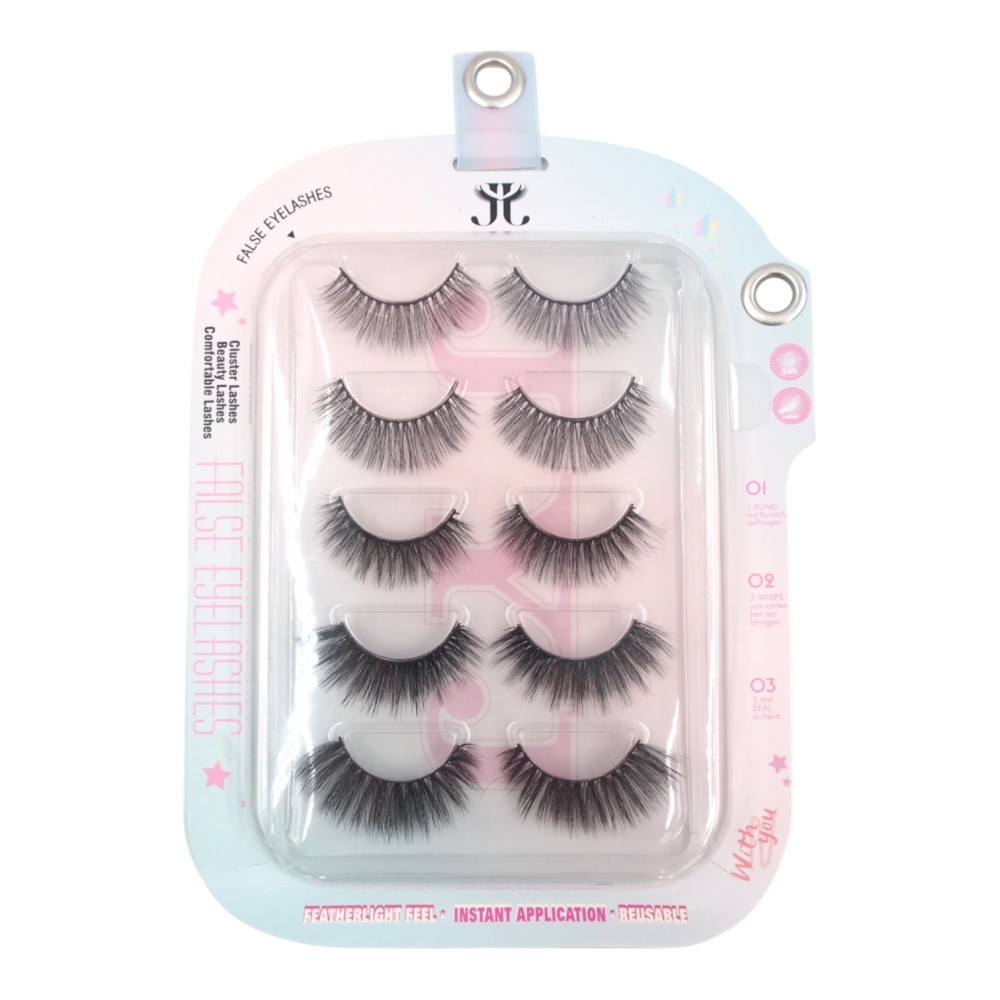 Rinkinyje yra net penkios kruopščiai suformuotos blakstienų poros, kurios leidžia kurti skirtingus makiažo stilius: