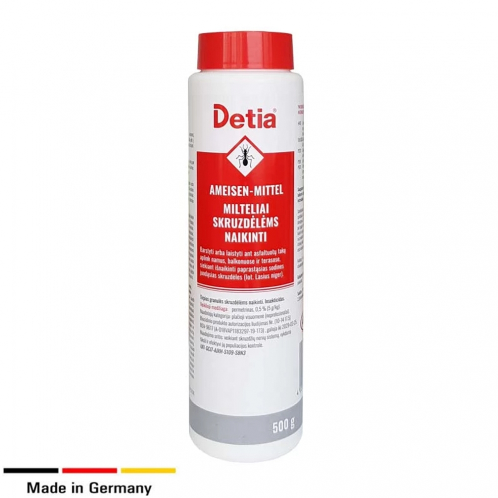 Detia birūs milteliai skruzdėlėms naikinti. Produktas taip pat veiksmingai veikia kitus vabzdžius, pvz., cukrinius žvyninukus, vėdarėlius.