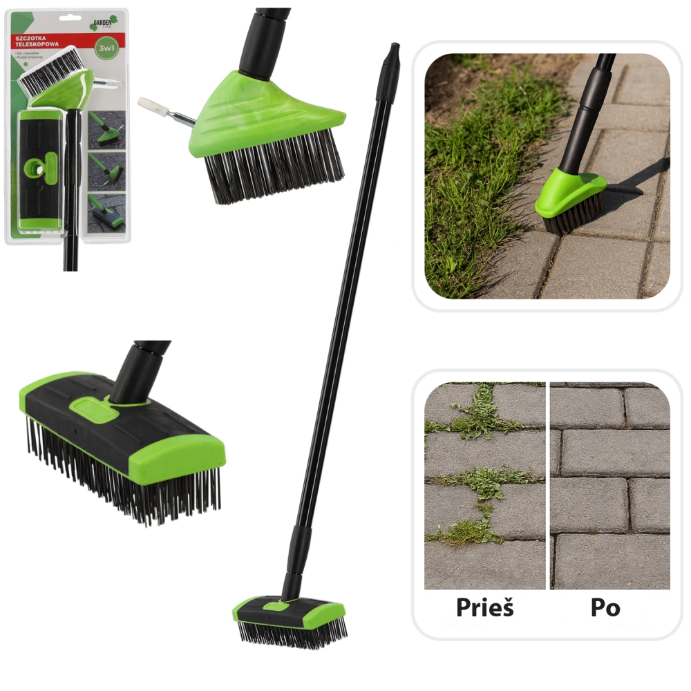 Teleskopinė šepečių sistema 3in1 skirta efektyviam trinkelių, plytelių, takelių, terasų ir kitų lauko paviršių valymui. Rinkinys leidžia greitai pašalinti žolę, samanas, piktžoles ir įsisenėjusius nešvarumus iš tarpų, neklaupiant ir neapkraunant nugaros.