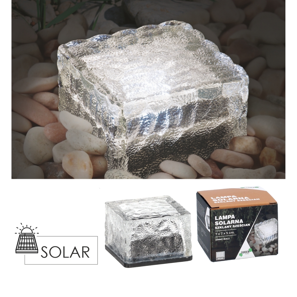 Stiklinė saulės lempa – kubas 7 × 7 × 5 cm, šaltai balta LED
