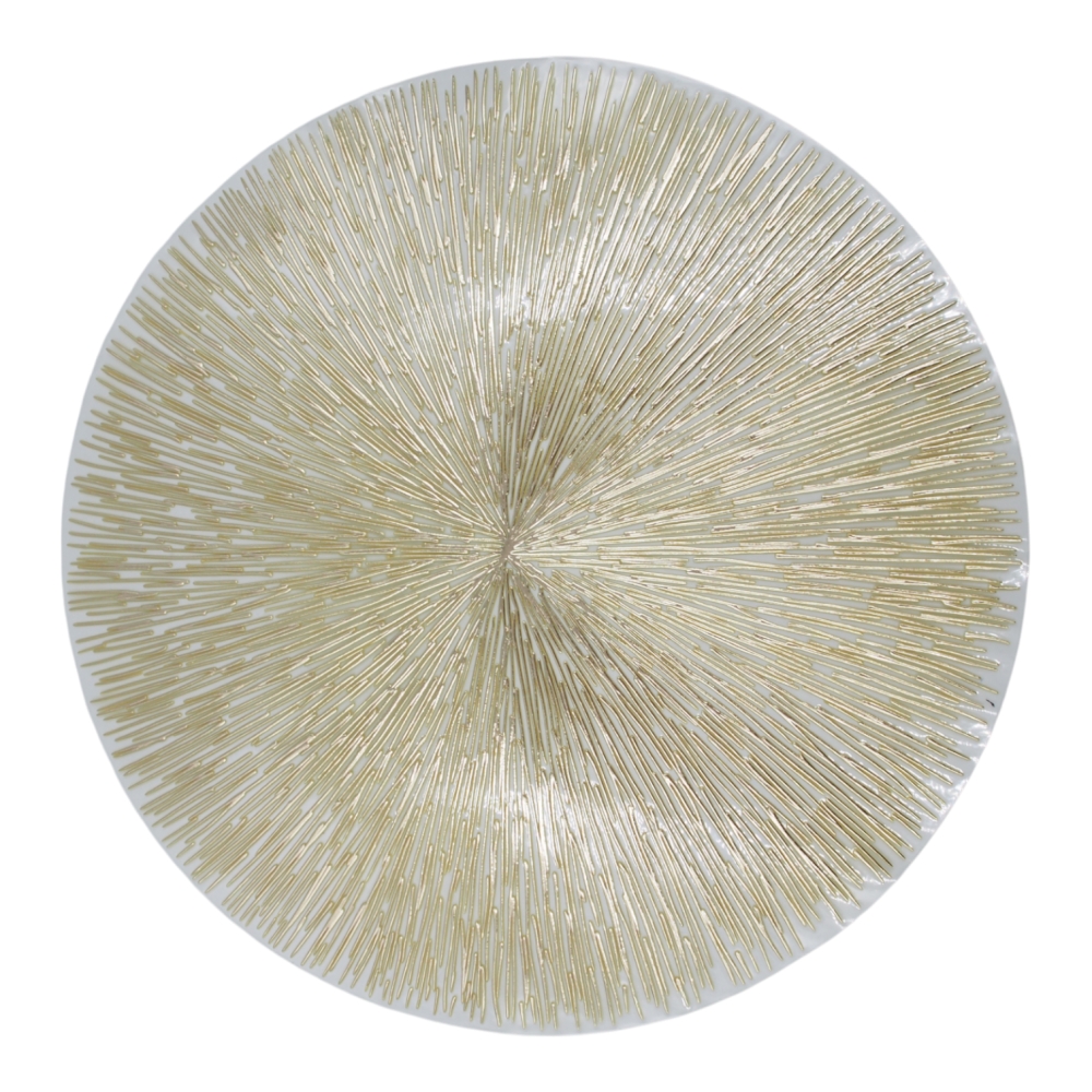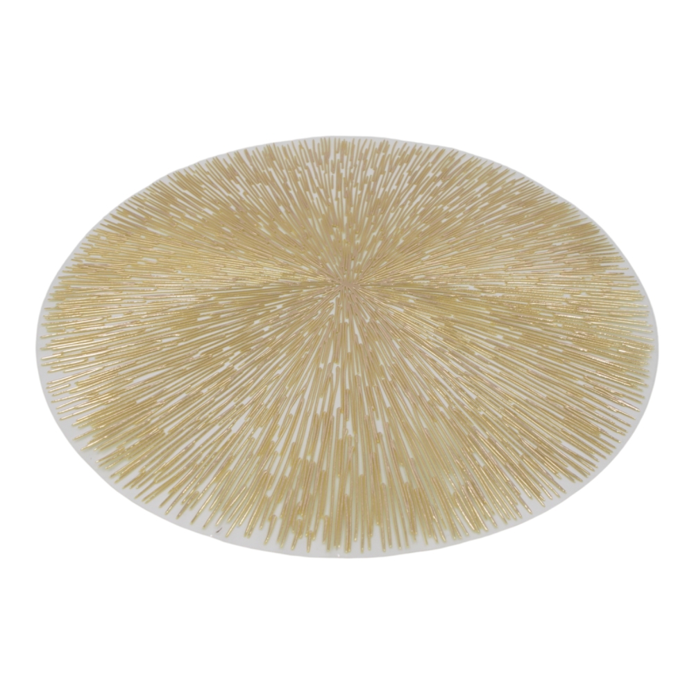 Papuoškite savo stalą išskirtiniu akcentu – šiuo elegantišku ir moderniu 38 cm skersmens stalo padėkliuku. Auksinės, spindulius primenančios linijos suteikia ypatingo prabangos pojūtį, todėl padėkliukas puikiai tinka tiek kasdieniam naudojimui, tiek šventėms ar ypatingoms progoms.