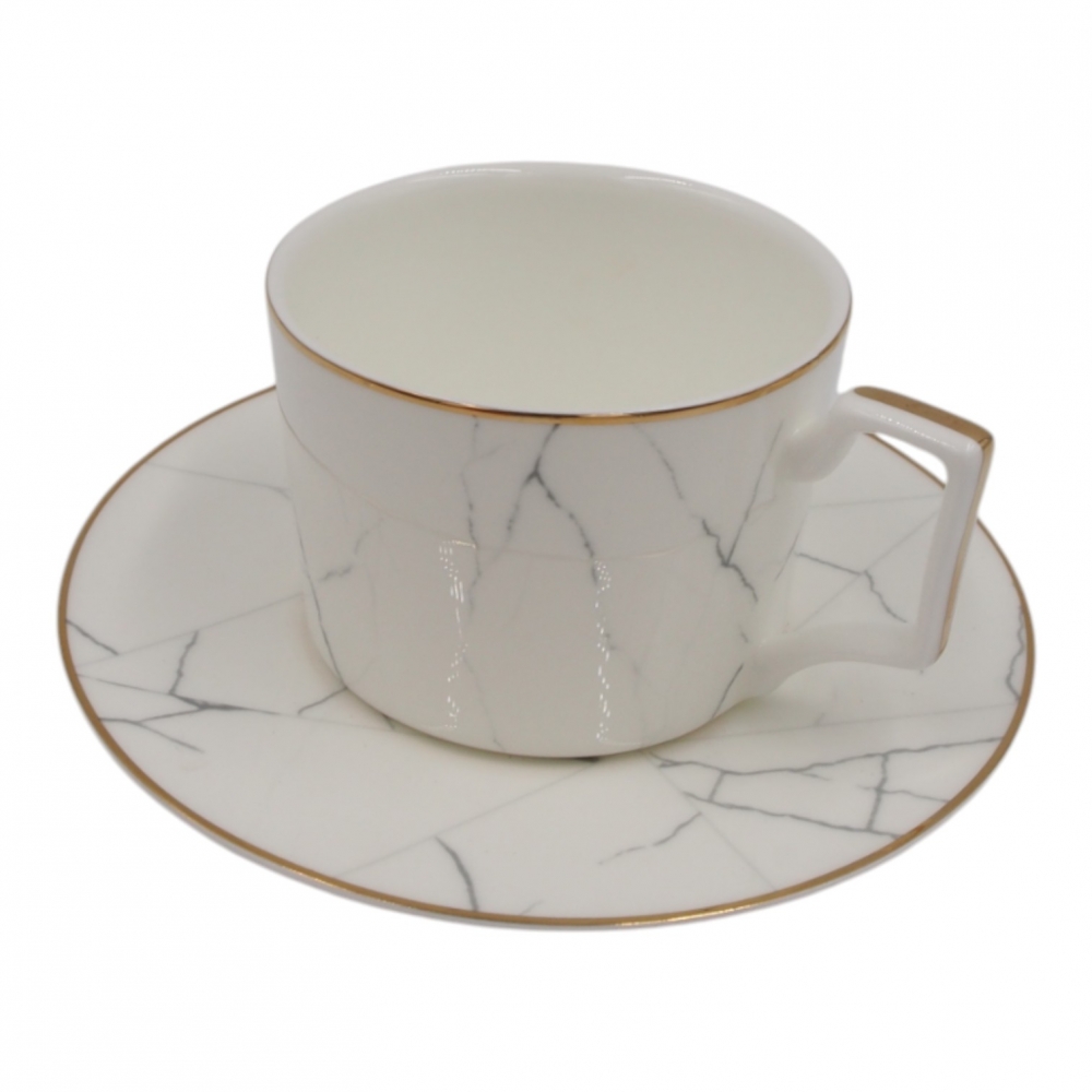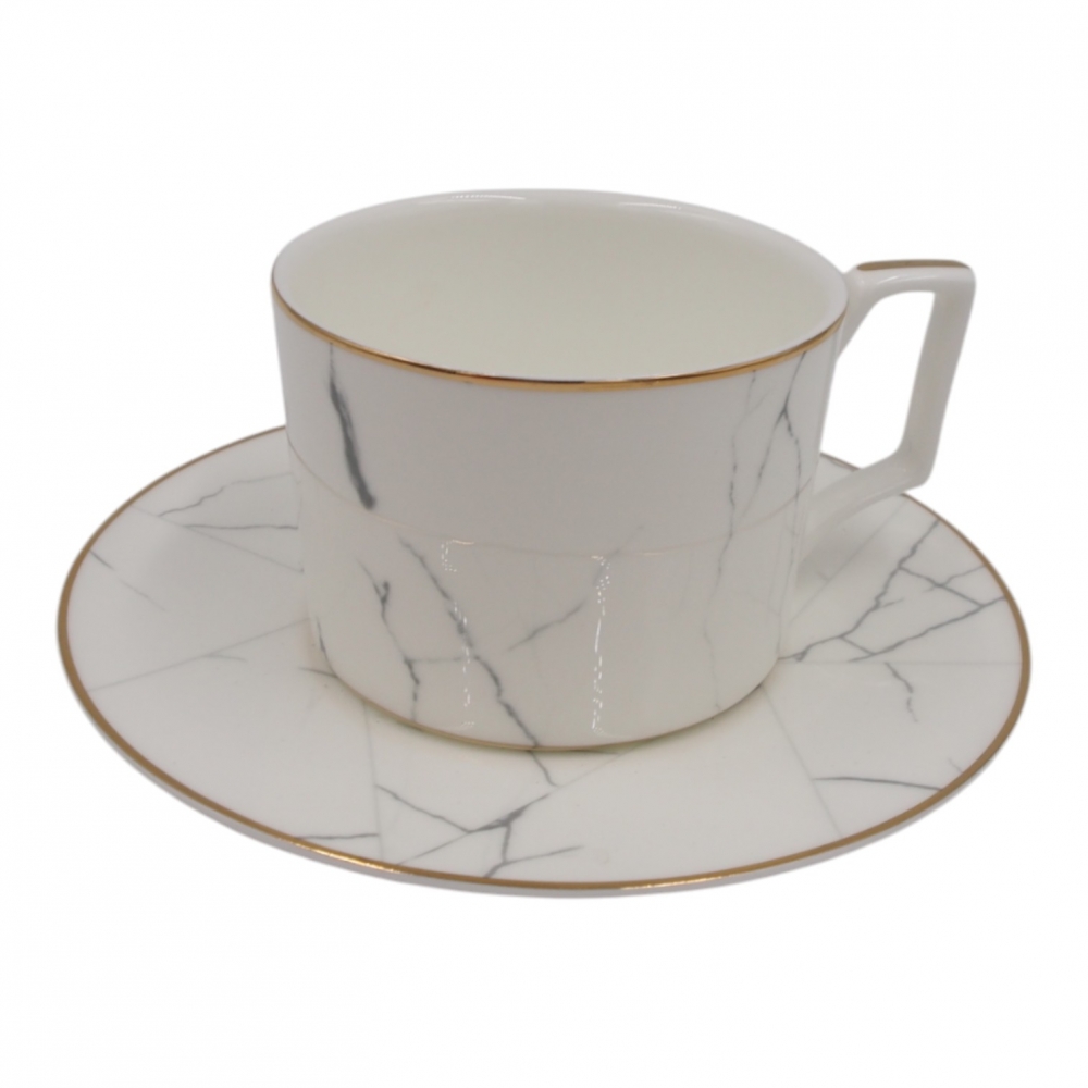 Elegantiškas porcelianinis puodelis su lėkštute, dekoruotas subtiliu marmuro raštu ir auksiniu krašteliu. Puikiai tinka kavai, arbatai ar karštam šokoladui. Modernus dizainas suteiks Jūsų stalui rafinuotumo, o kokybiška medžiaga užtikrins ilgaamžiškumą.