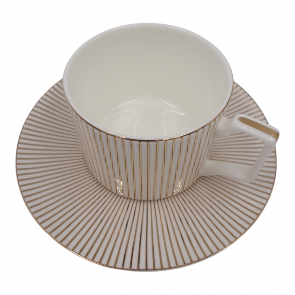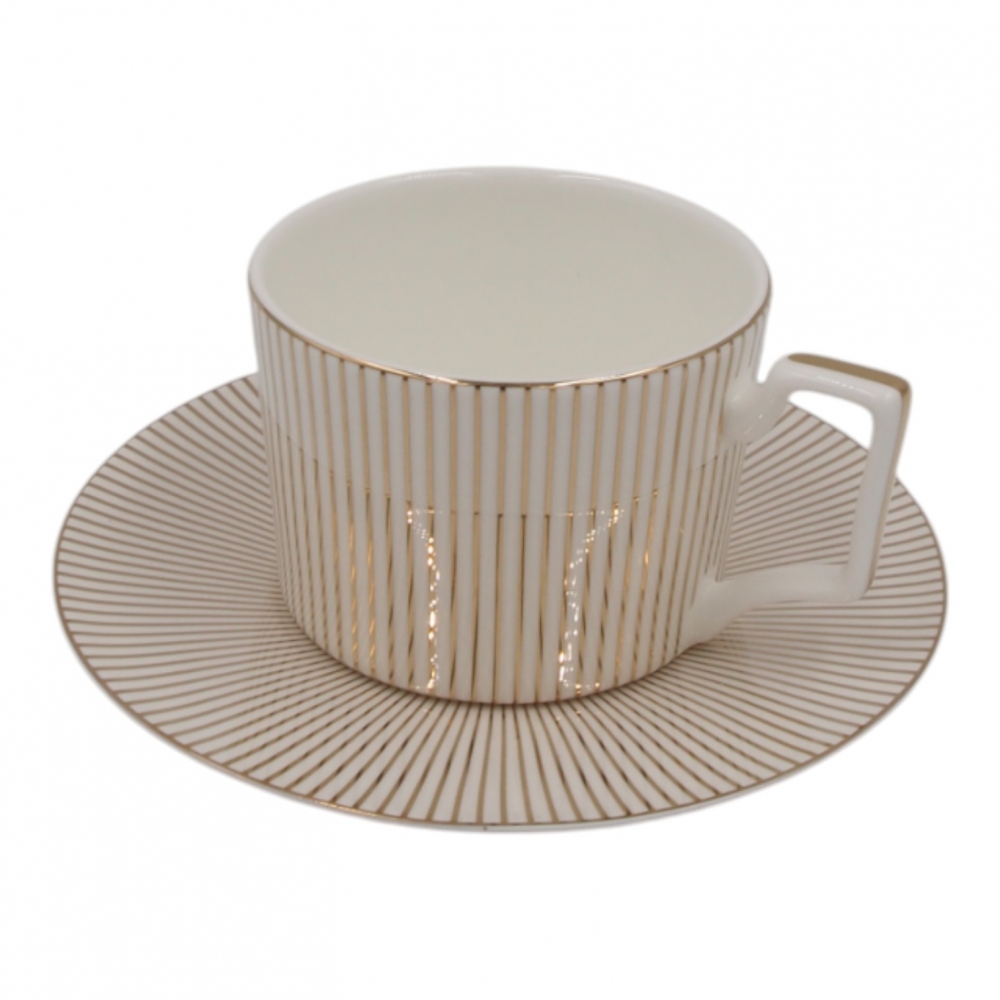 Elegantiškas porcelianinis puodelis su lėkštute, dekoruotas subtiliomis auksinėmis linijomis. Modernus dizainas ir klasikinė forma suteikia prabangos pojūtį, o 275 ml talpa idealiai tinka mėgstamai kavai, arbatai ar kitiems gėrimams.