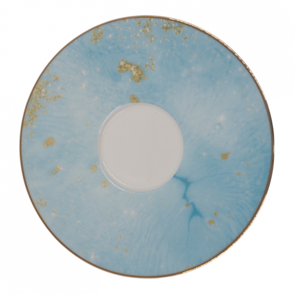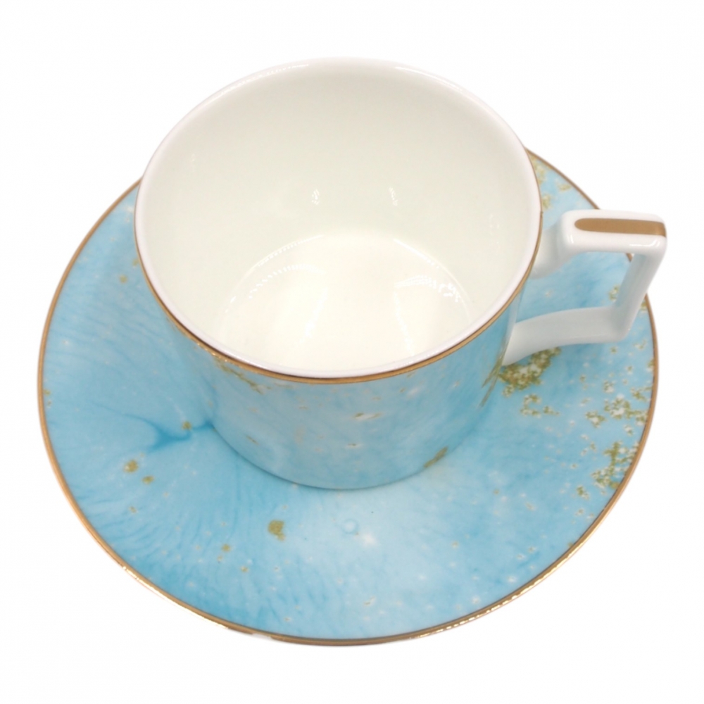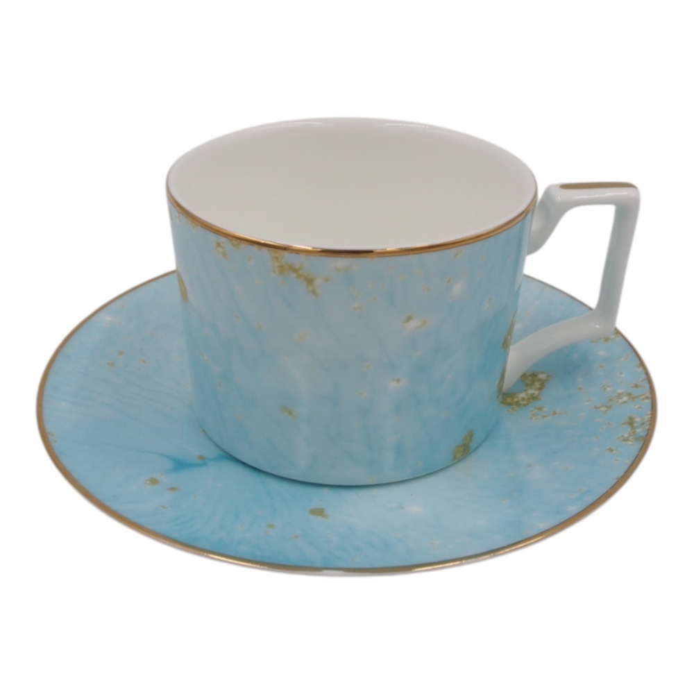 Išskirtinio dizaino porcelianinis puodelis su lėkštute, dekoruotas šviesiai mėlynu fonu ir subtiliomis auksinėmis detalėmis. Talpa – 275 ml – idealiai tinka kavai, arbatai ar kitiems mėgstamiems gėrimams. Auksinis kraštelis suteikia papildomos elegancijos ir prabangos.
