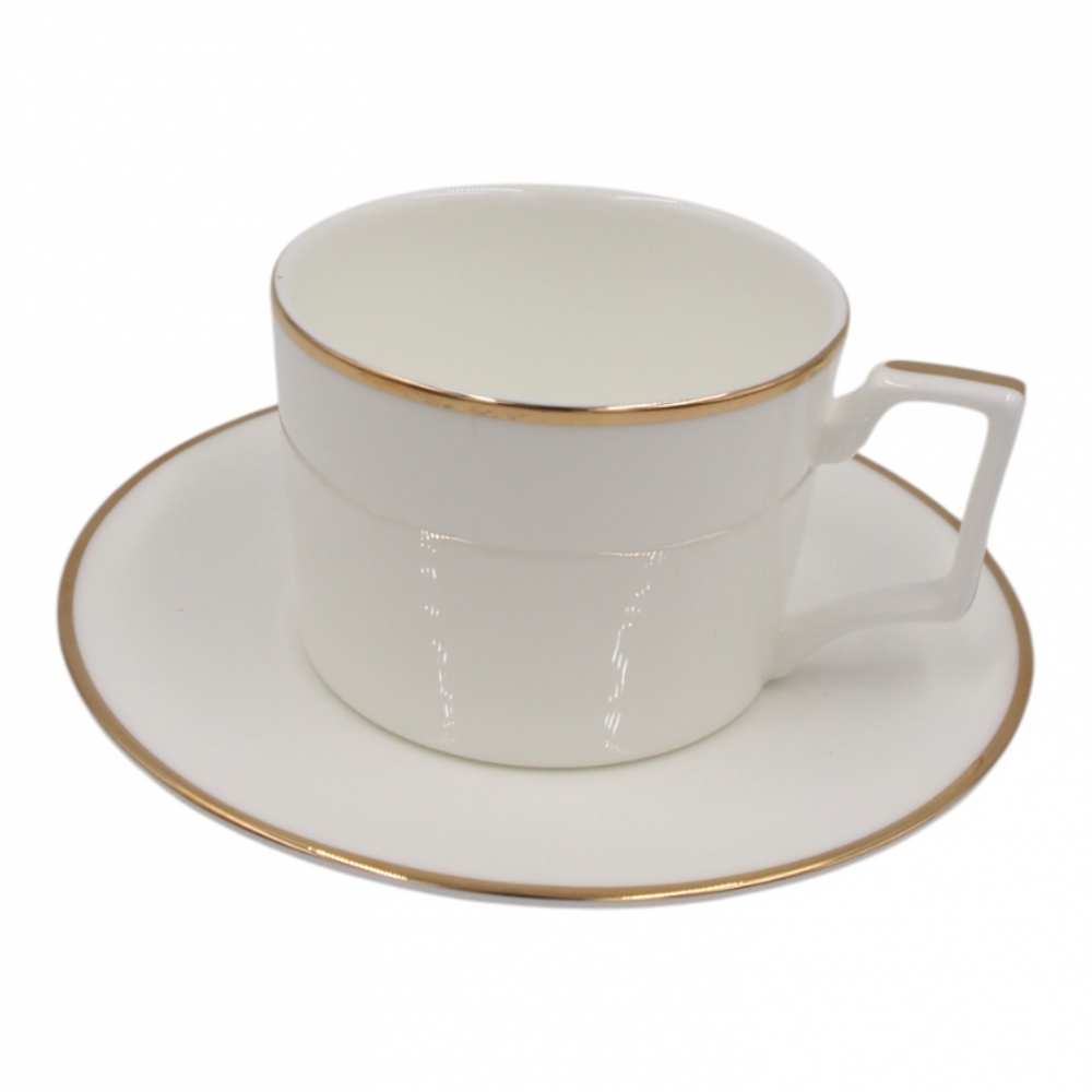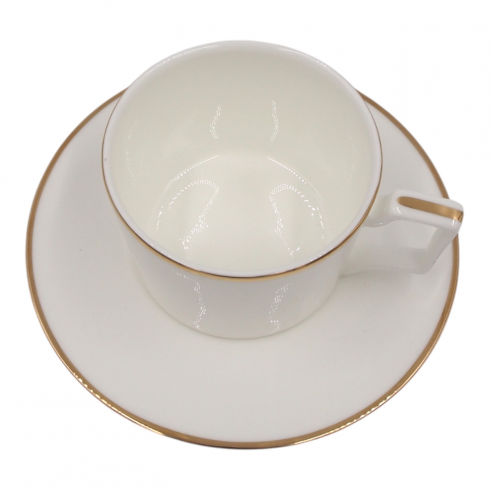 Klasikinio dizaino porcelianinis puodelis su lėkštute – puikus pasirinkimas tiek kasdieniam naudojimui, tiek stalo serviravimui ypatingomis progomis. Baltos spalvos puodelį puošia subtilus auksu dekoruotas kraštelis, suteikiantis elegancijos ir prabangos pojūtį.