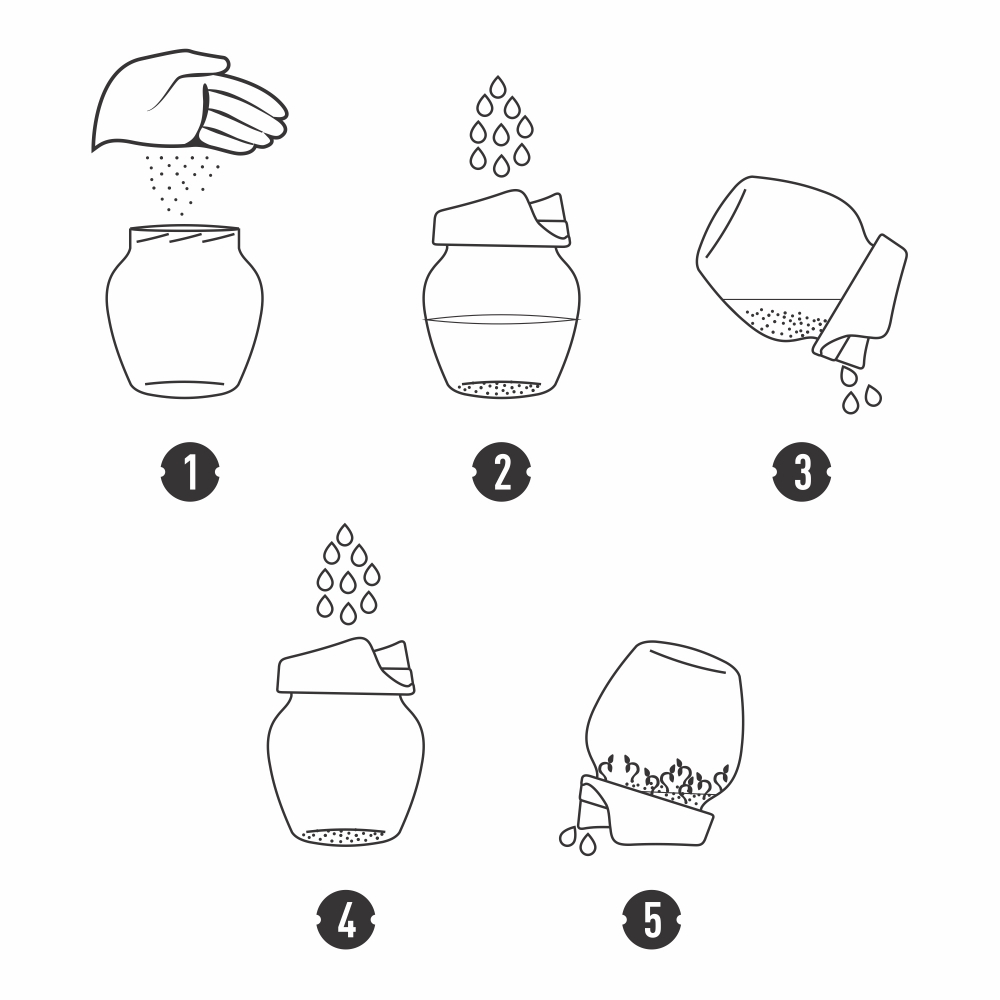 Užsukite daigyklos dangtelį su sieteliu ir pripilkite stiklainį vandens. Palikite sėklas mirkti apie 24 valandas.