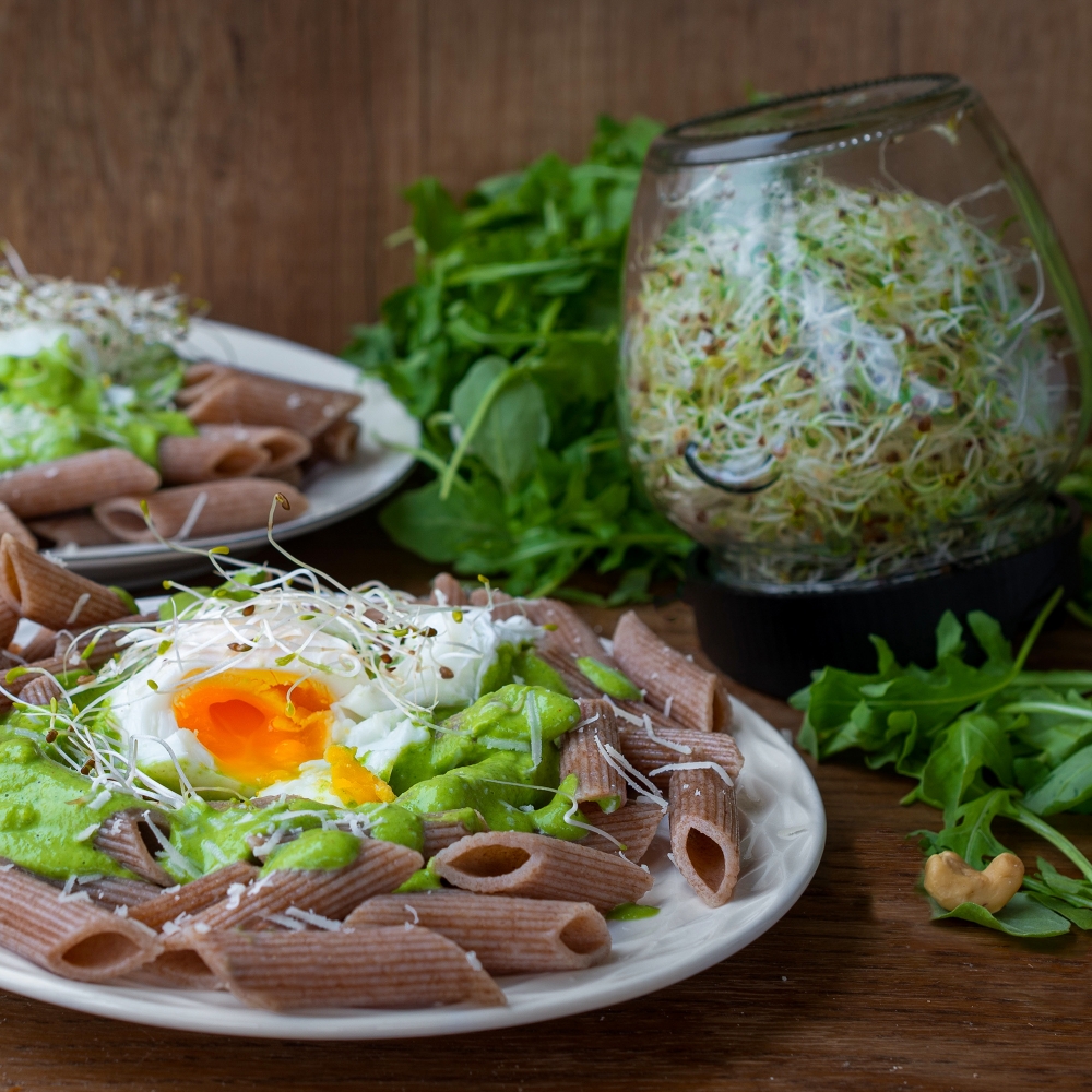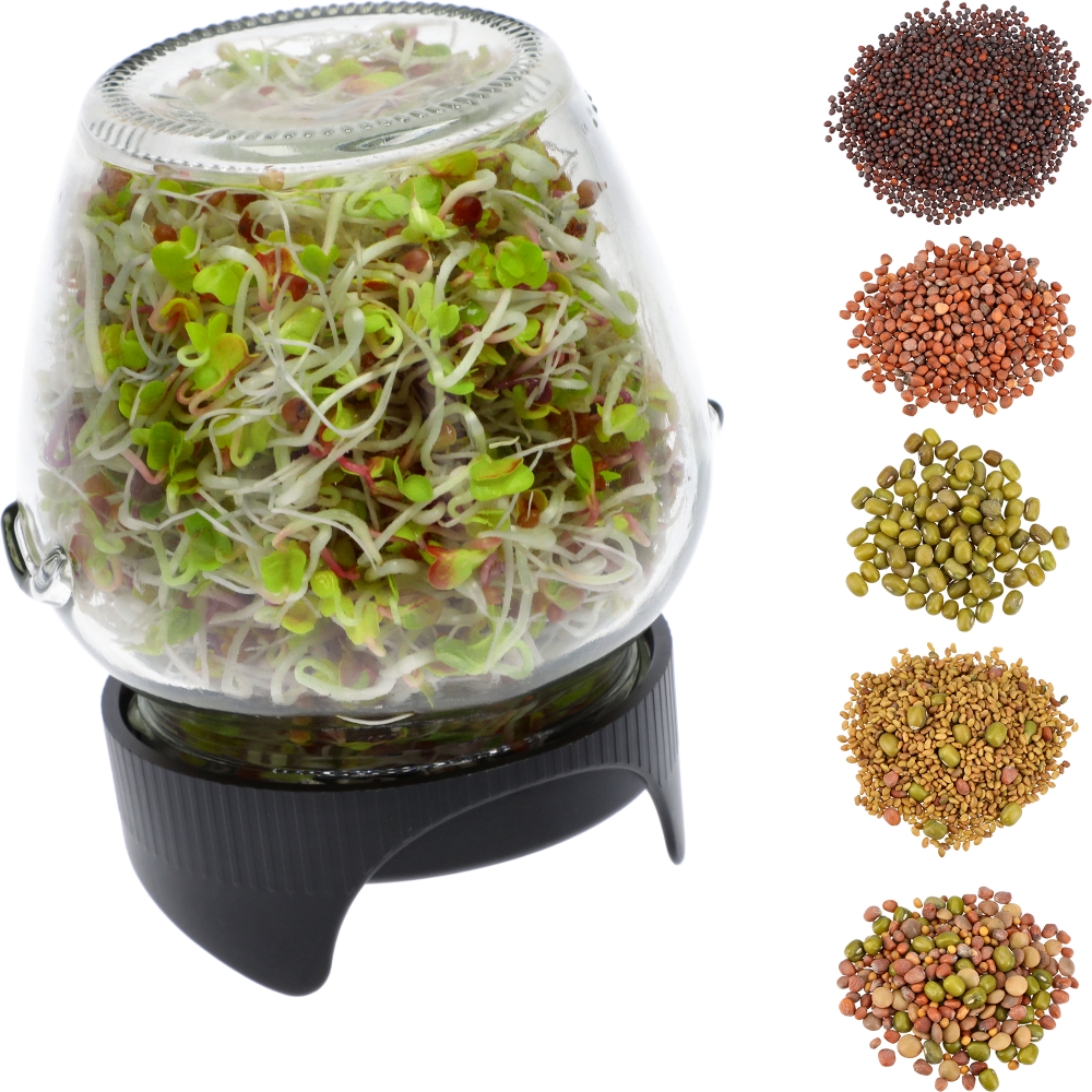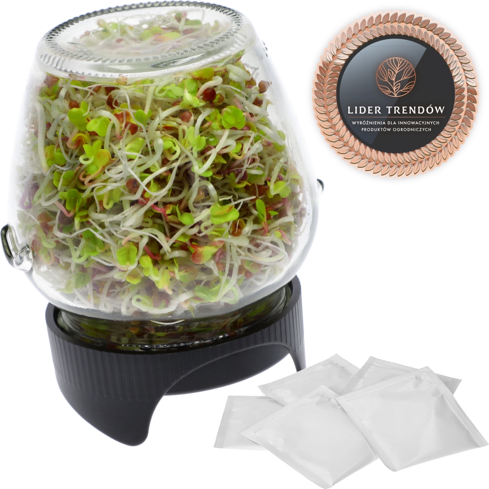 Ši inovatyvi stiklainio daigykla su specialiai suprojektuotu dangteliu ir sieteliu leidžia auginti daigus stiklainyje, pastatytame apie 15° kampu. Toks sprendimas užtikrina tinkamą vandens nutekėjimą ir optimalią oro cirkuliaciją, reikalingą sėkmingam daiginimui. Sietelis taip pat gali būti naudojamas skysčių nukošimui, nuosėdų ar smulkių dalelių atskyrimui bei arbatos ruošimui.