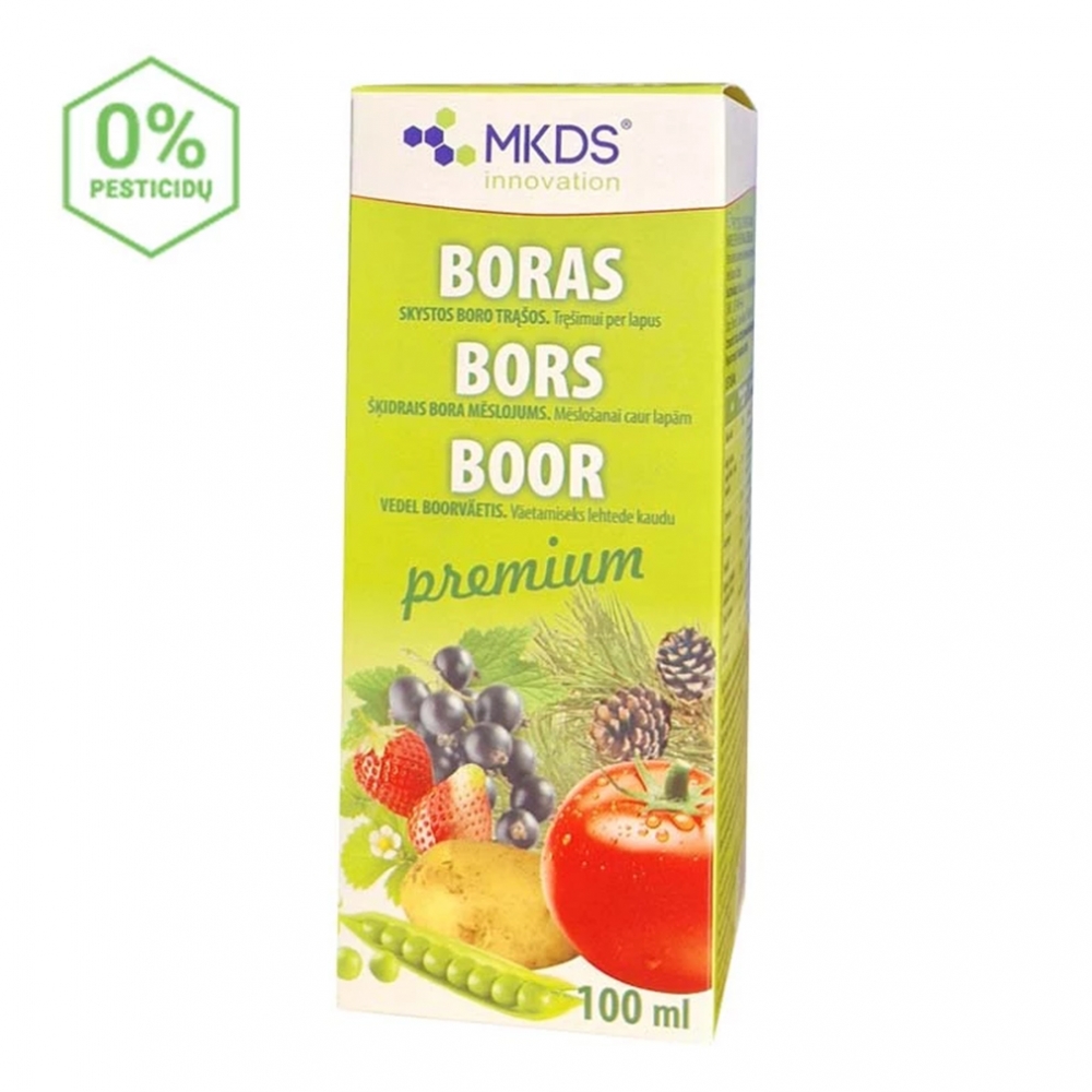 Kaip atpažinti boro trūkumą?Esant nedideliam boro trūkumui, ryškių simptomų ant augalo nesimato – sulėtėja augimas. Esant dideliam boro trūkumui, simptomai išryškėja ant intensyviausiai augančių dalių – augalai ima gelsti, nustoja augti viršūnės, jauni lapeliai, vaisių užuomazgos.Esant ypač dideliam boro trūkumui, žiedų visai nebūna arba jų būna žymiai mažiau nei įprastai.