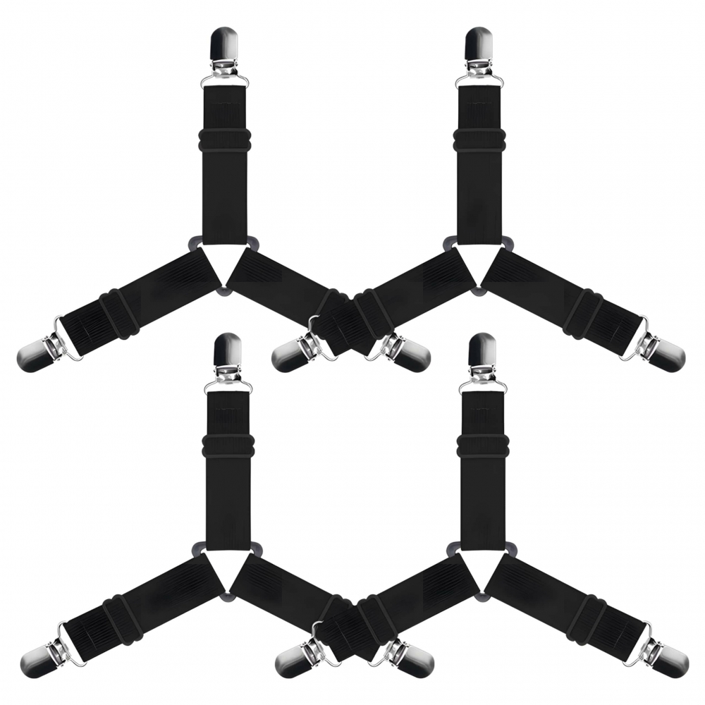 Reguliuojamo ilgio dirželiai leidžia lengvai pritaikyti juos prie įvairaus pločio čiužinių. Tvirti plieniniai spaustukai patikimai laiko paklodę vietoje ir apsaugo nuo jos nuslydimo nuo lovos.