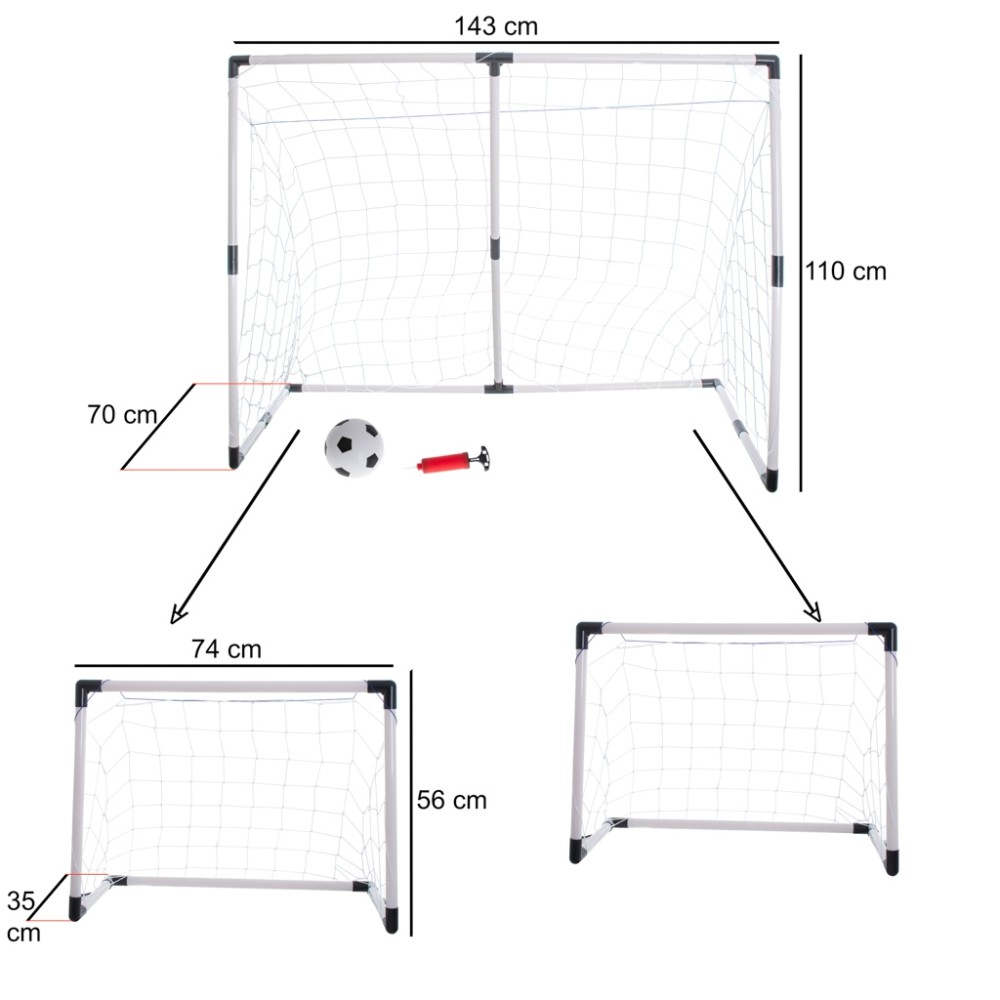 Vaikiški futbolo vartai 2in1 – dideli arba du mažesni (143 × 110 × 70 cm)Puikus pasirinkimas mažiesiems futbolo entuziastams! Šie 2in1 futbolo vartai suteikia galimybę rinktis – naudoti vienus didelius vartus treniruotėms arba padalinti į du mažesnius pilnaverčiam žaidimui su draugais.